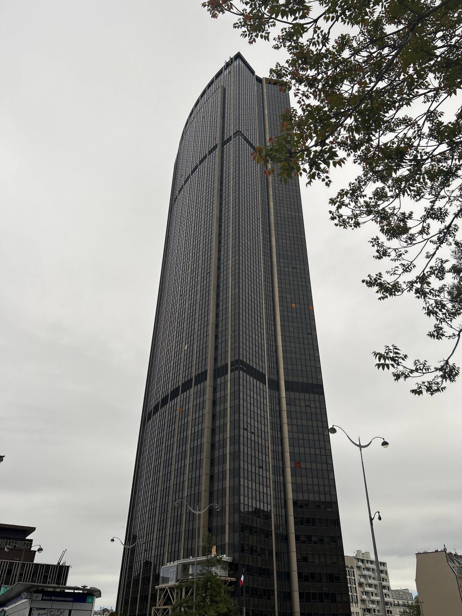 The image captures a low-angle view of the Tour Montparnasse in Paris, France. The tall, black skyscraper dominates the scene, its grid-like facade stretching upwards towards a cloudy sky. Partial vie…read more