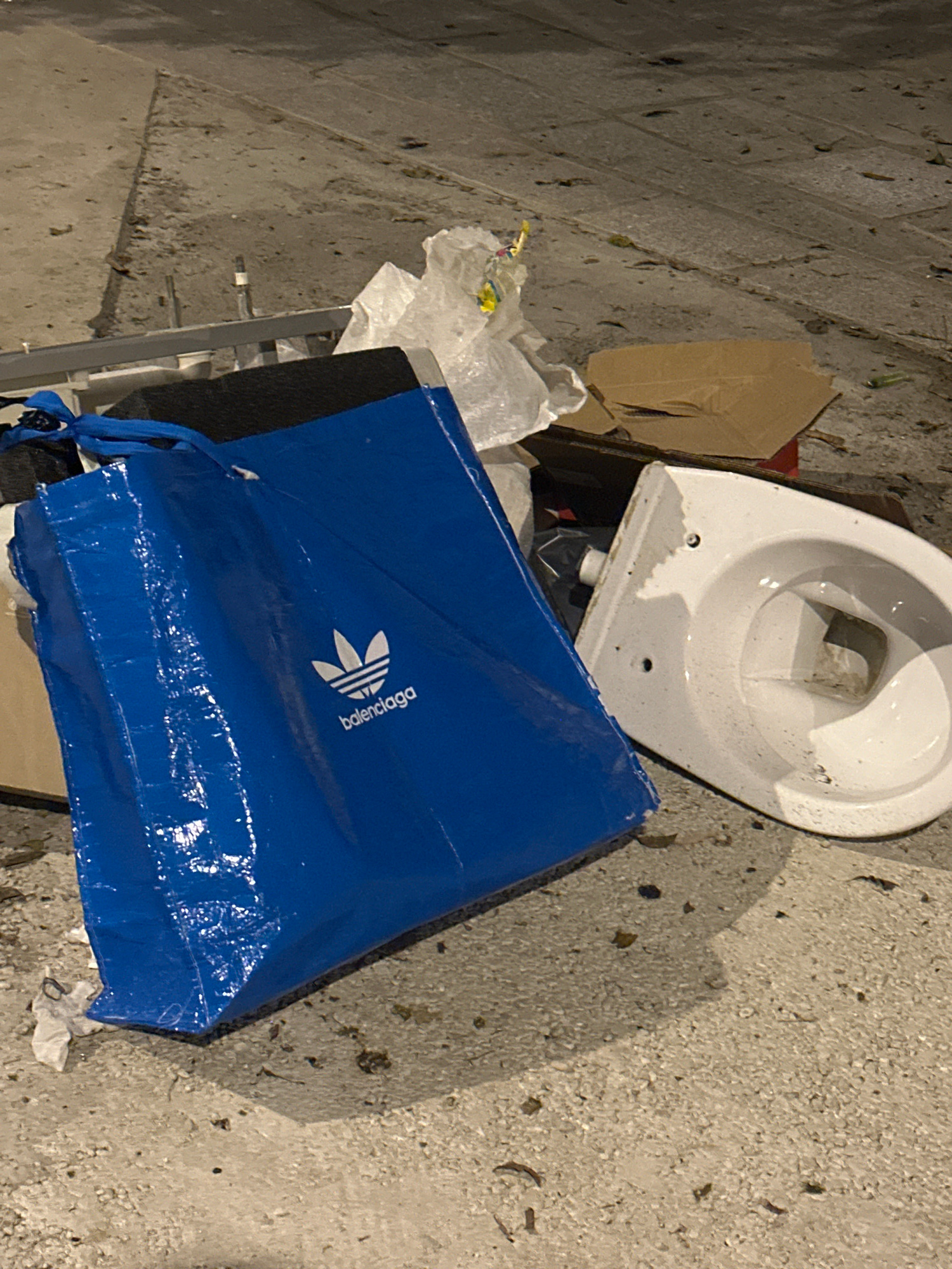 The image shows a discarded toilet bowl, a cardboard box, and a blue plastic bag with the Adidas and Balenciaga logos, all lying on a concrete surface. The scene appears to be outdoors. It is not poss…read more