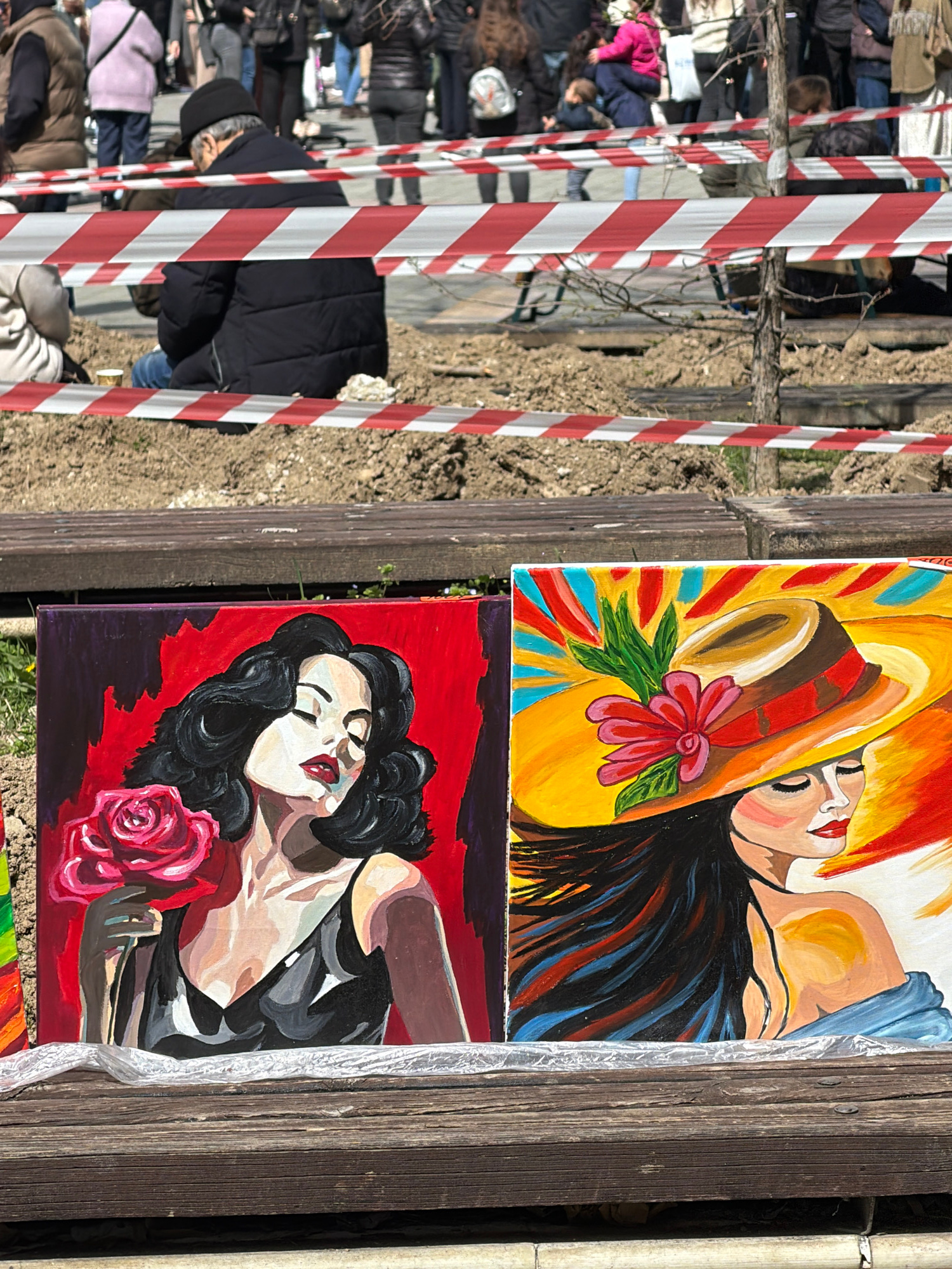 The image shows an outdoor art display in Pazardzhik, Bulgaria. Two paintings depicting women are propped against a wooden structure. The upper painting shows a woman with a wide-brimmed yellow hat ad…read more