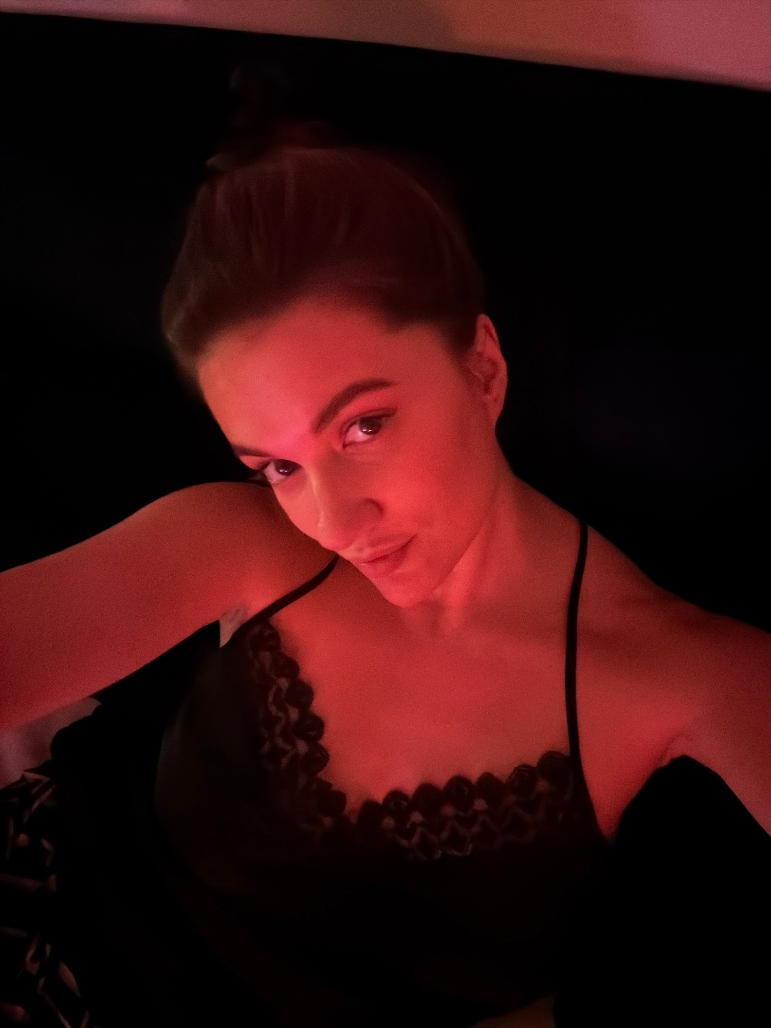 A woman is the central subject of this image, captured in a dimly lit environment, presumably indoors. The lighting gives a strong red hue to her skin and surroundings. She is wearing a black top with…read more