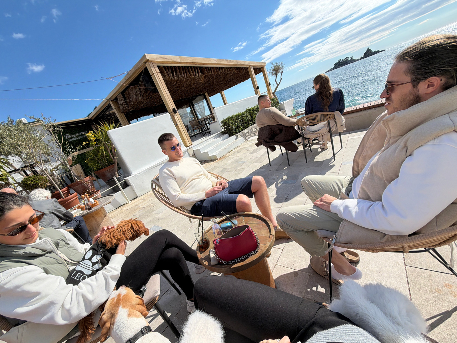 A group of people is seated outdoors at a seaside cafe or restaurant in Petrovac centar, Montenegro. Three people are at the foreground, seated in wicker chairs and dressed in casual clothing, with tw…read more