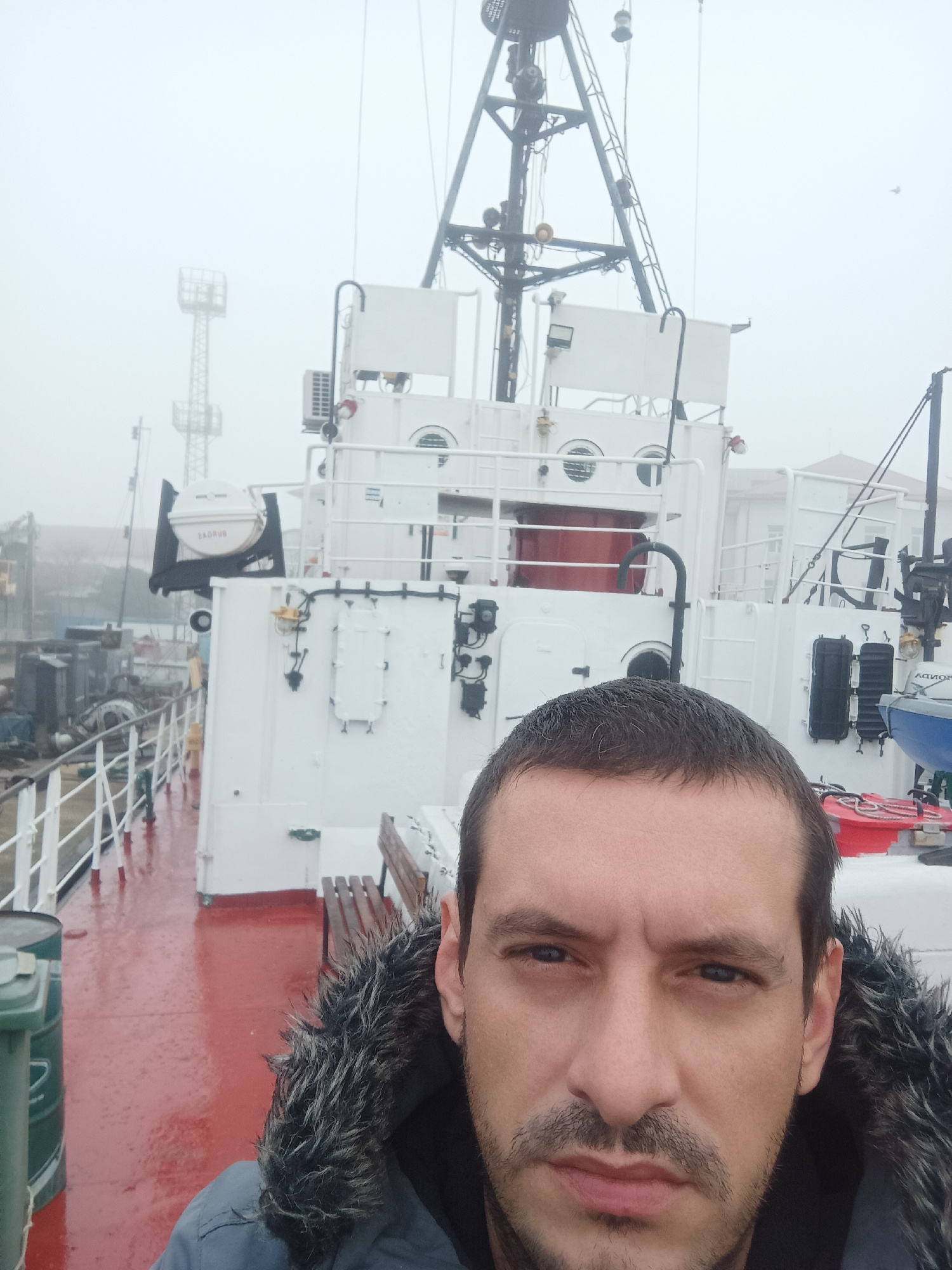 The image depicts a man taking a selfie on a ship in Burgas, Bulgaria. The background shows the ship's white structure and a foggy cityscape, suggesting a coastal location. The man is wearing a hooded…read more