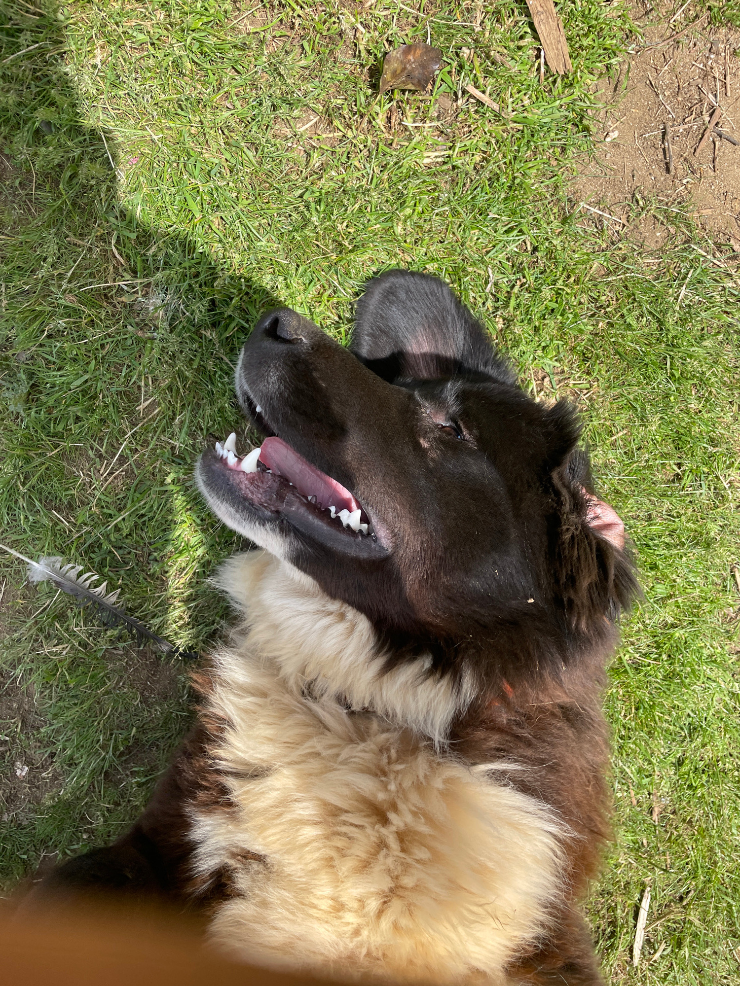 A medium-sized, tri-color dog with black, brown, and cream-colored fur is lying on its side in a patch of green grass. The dog's mouth is open, revealing its teeth and pink tongue. A feather lies near…read more