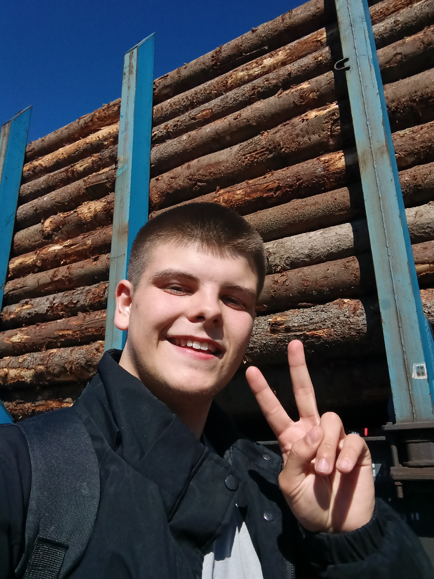 A young man, likely in his late teens or early twenties, is captured in a selfie smiling broadly and making a peace sign with his left hand. He has short brown hair and is wearing a dark jacket, possi…read more