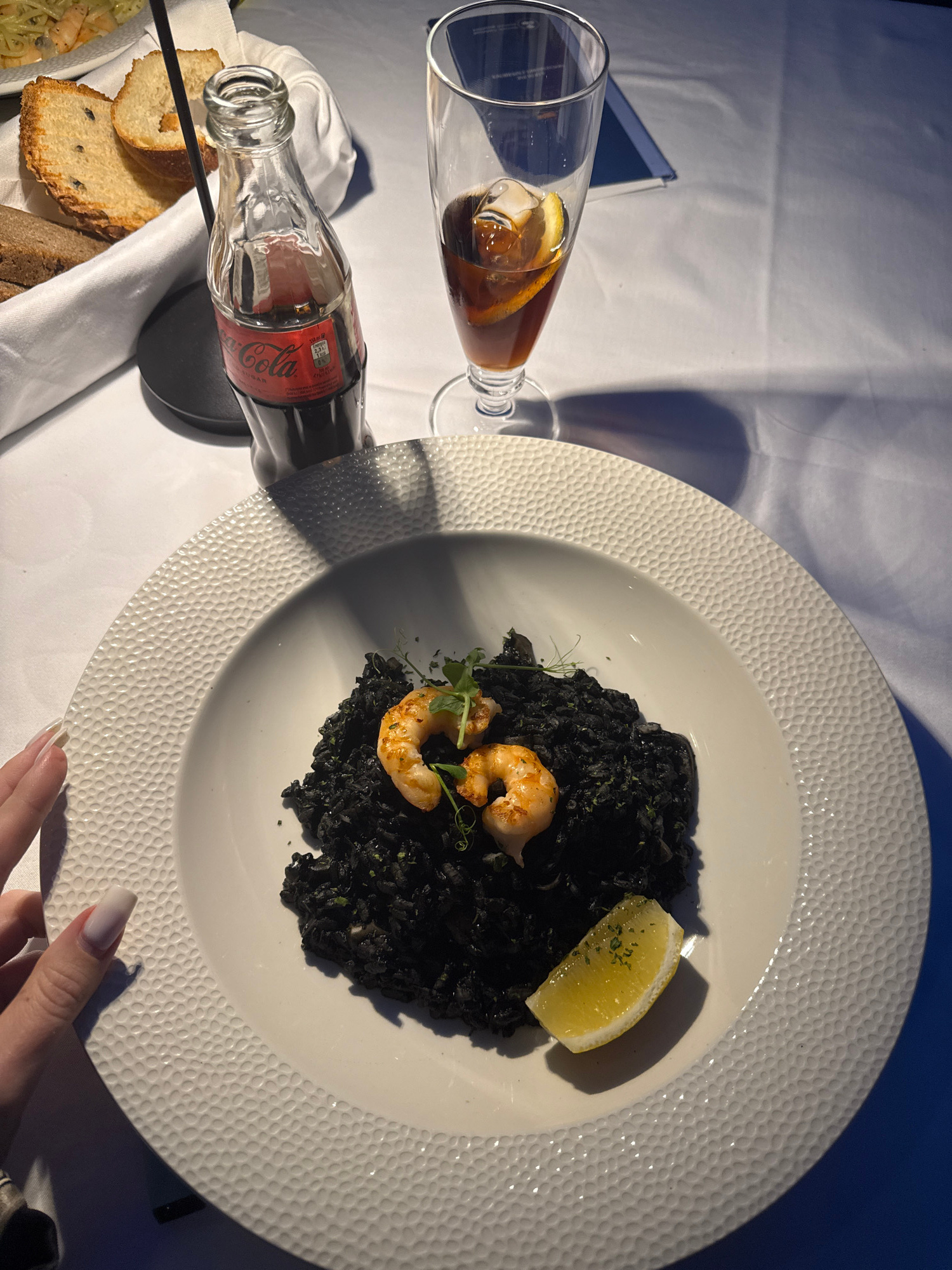 The image presents a table setting with food and drinks, potentially taken in Perast, Montenegro. A white plate dominates the scene, containing dark, possibly squid ink risotto, adorned with shrimp an…read more