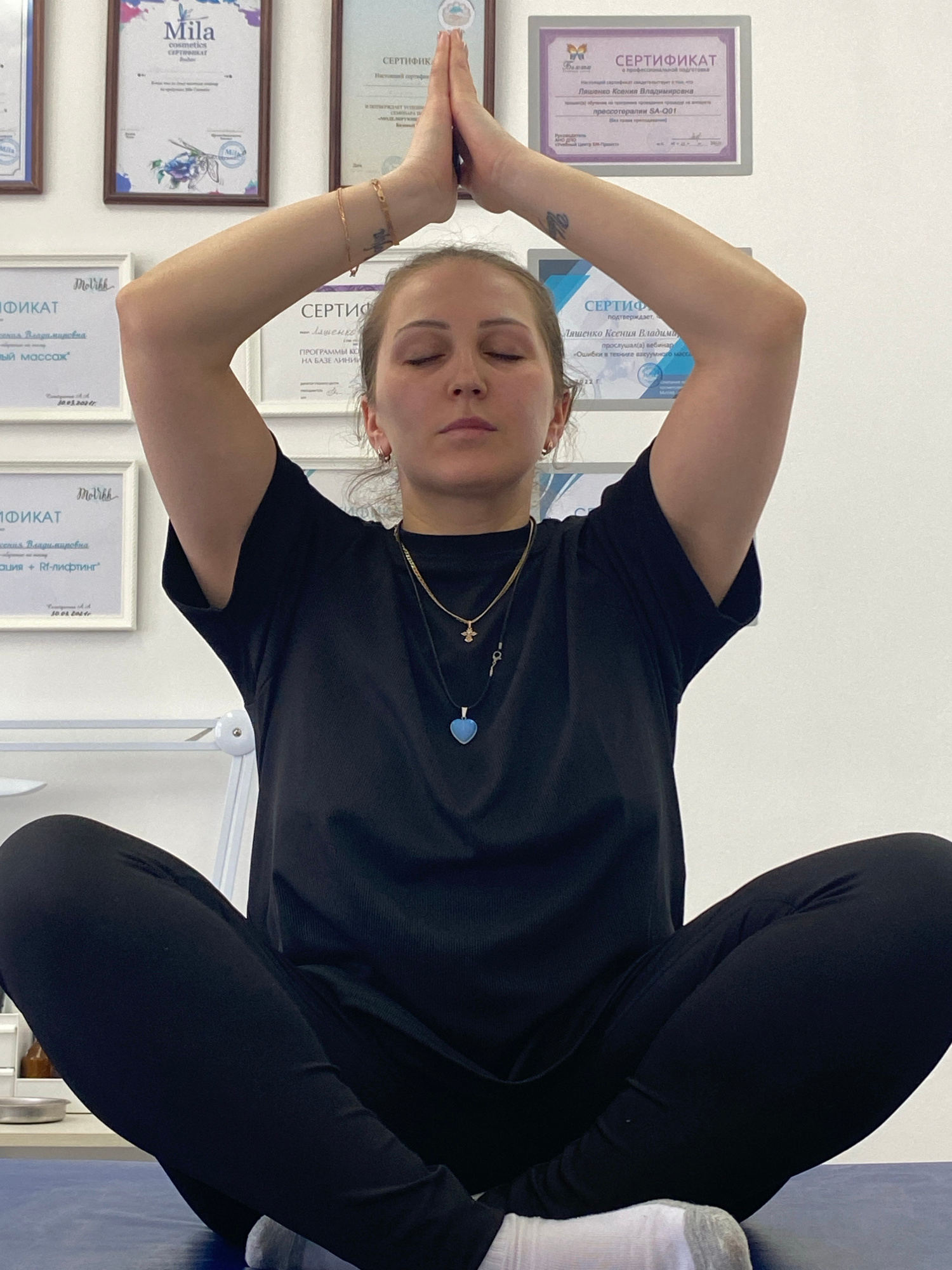 The image shows a woman wearing black leggings and a black t-shirt seated with her legs crossed and arms raised, her hands meeting above her head, possibly engaging in a yoga or meditation pose. She is also wearing a necklace. Behind her on the wall are several framed certificates and diplomas. Some text is discernible on them in the Russian language. Some of the titles read "CERTIFICATE" and contain Russian names such as "Ksenia Vladimirovna" and brands like "Mila cosmetics". One certificate mentions "RF-lifting". It's difficult to pinpoint the exact location in the city of Markovskiy, Russia based on the image. | Open Wire