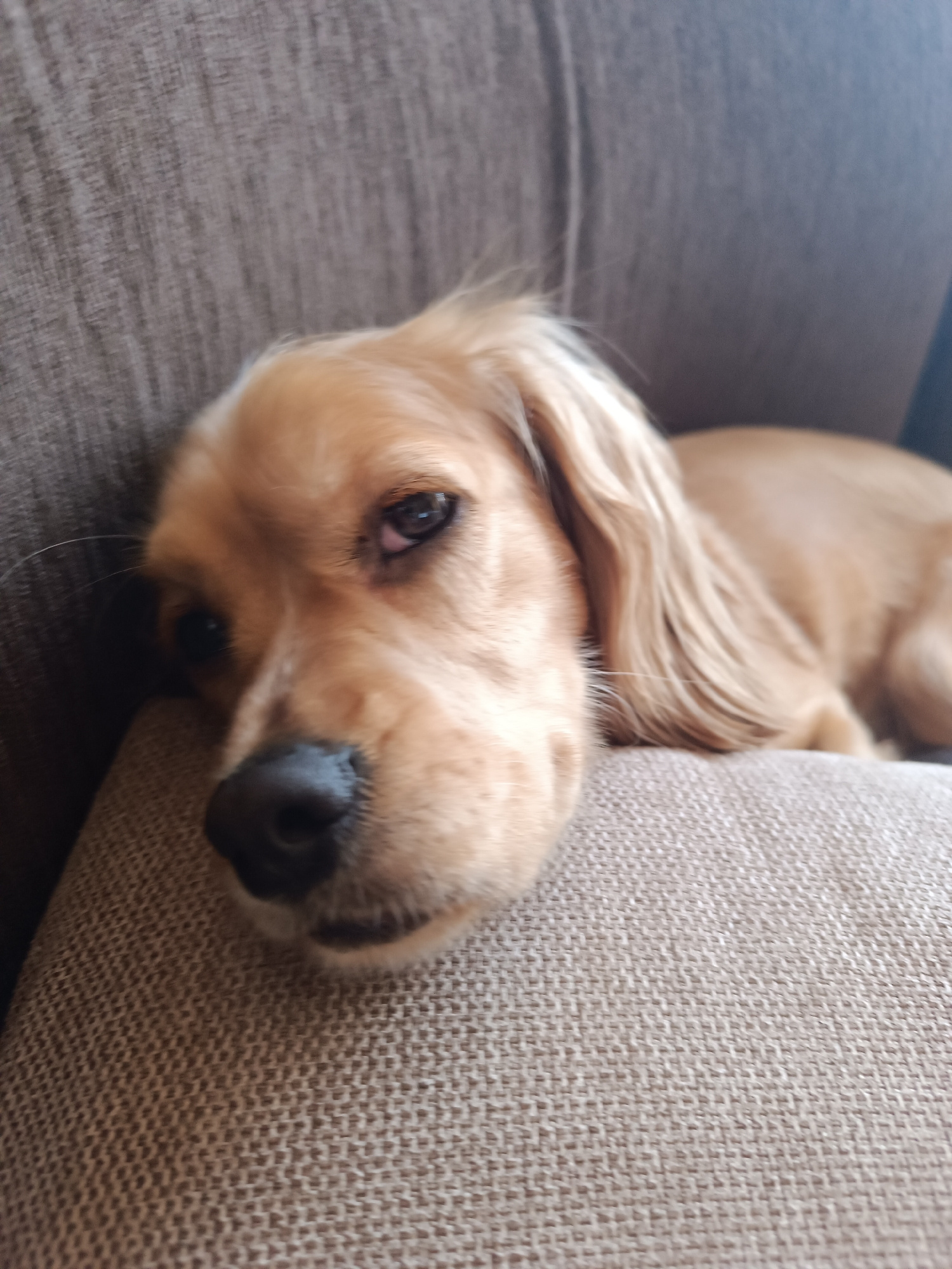A tan cocker spaniel rests its head on a tan woven couch. The dog is lying down, facing the viewer, with its head resting on the arm of the couch. The background is a blurry darker brown, likely anoth…read more