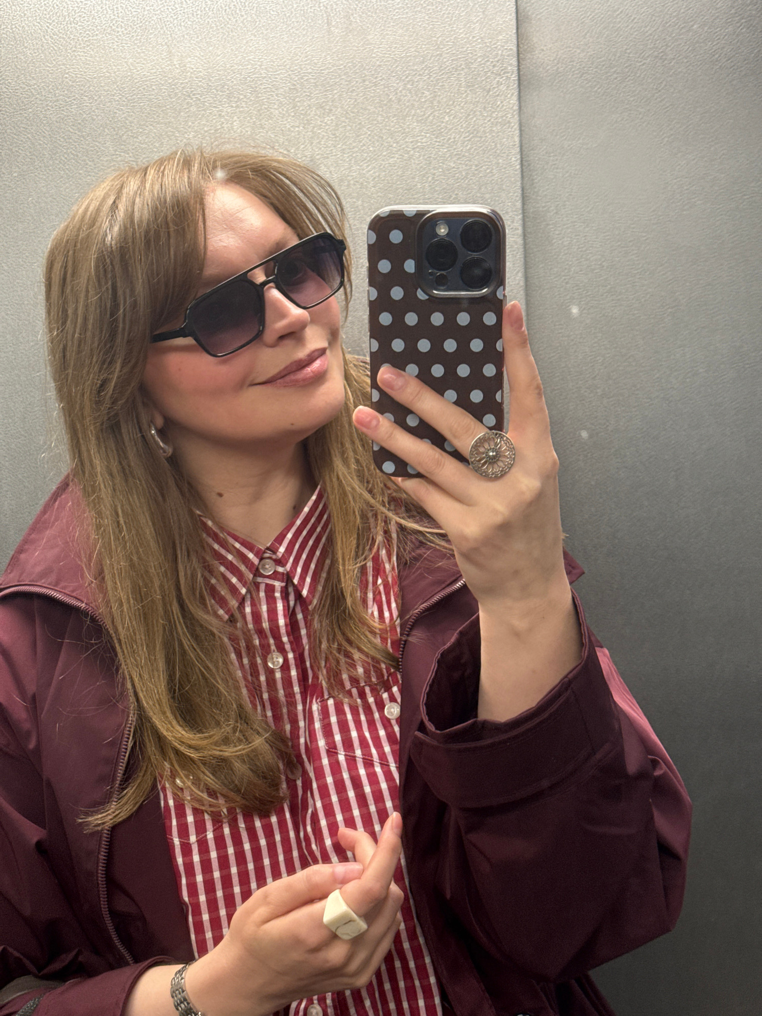 A person is captured in a selfie taken indoors, with the image rotated 90 degrees clockwise. The subject appears to be a young adult with long, light brown hair, wearing dark sunglasses that obscure m…read more