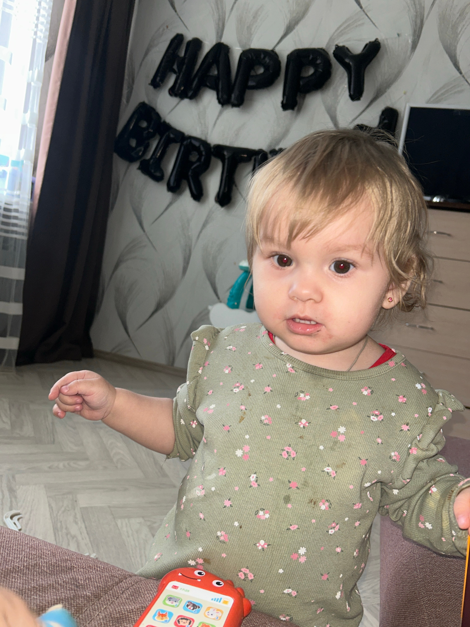 A young, fair-skinned child with blonde hair and brown eyes is the primary subject of the image. The child is wearing a long-sleeved, patterned top. There are smudges or stains visible on the child'sā¦read more