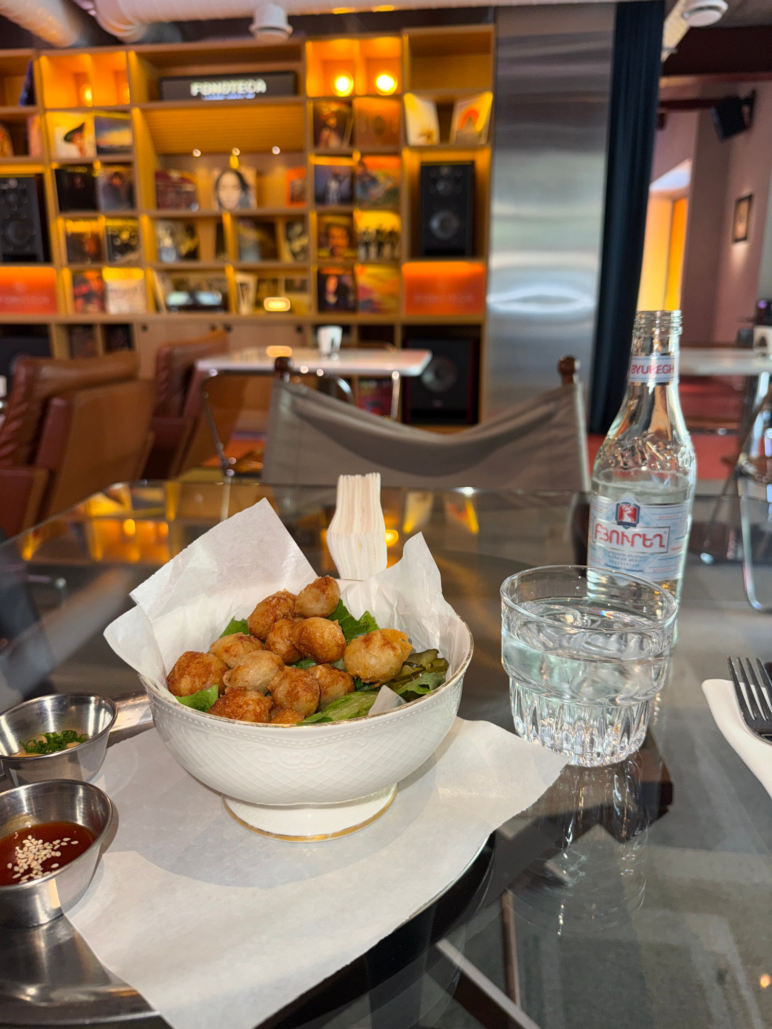 This image captures a close-up view of a dining table in what appears to be a cafe or restaurant in Yerevan, Armenia. The table itself is dark and highly reflective, showing blurred reflections of the…read more
