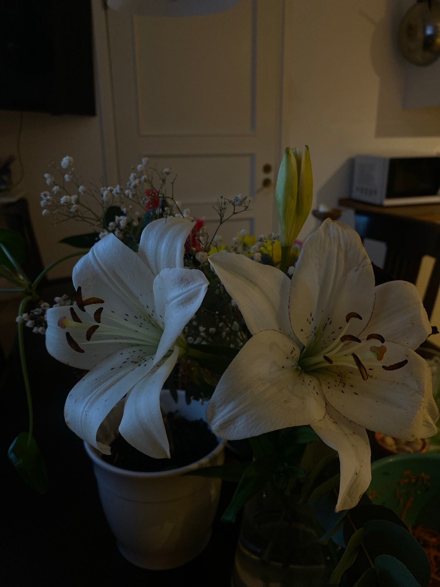 A high-angle shot shows two white lily flowers in a white vase. The flowers are surrounded by baby's breath and green leaves. One flower is fully open, while the other is partially open. The stamen is…read more