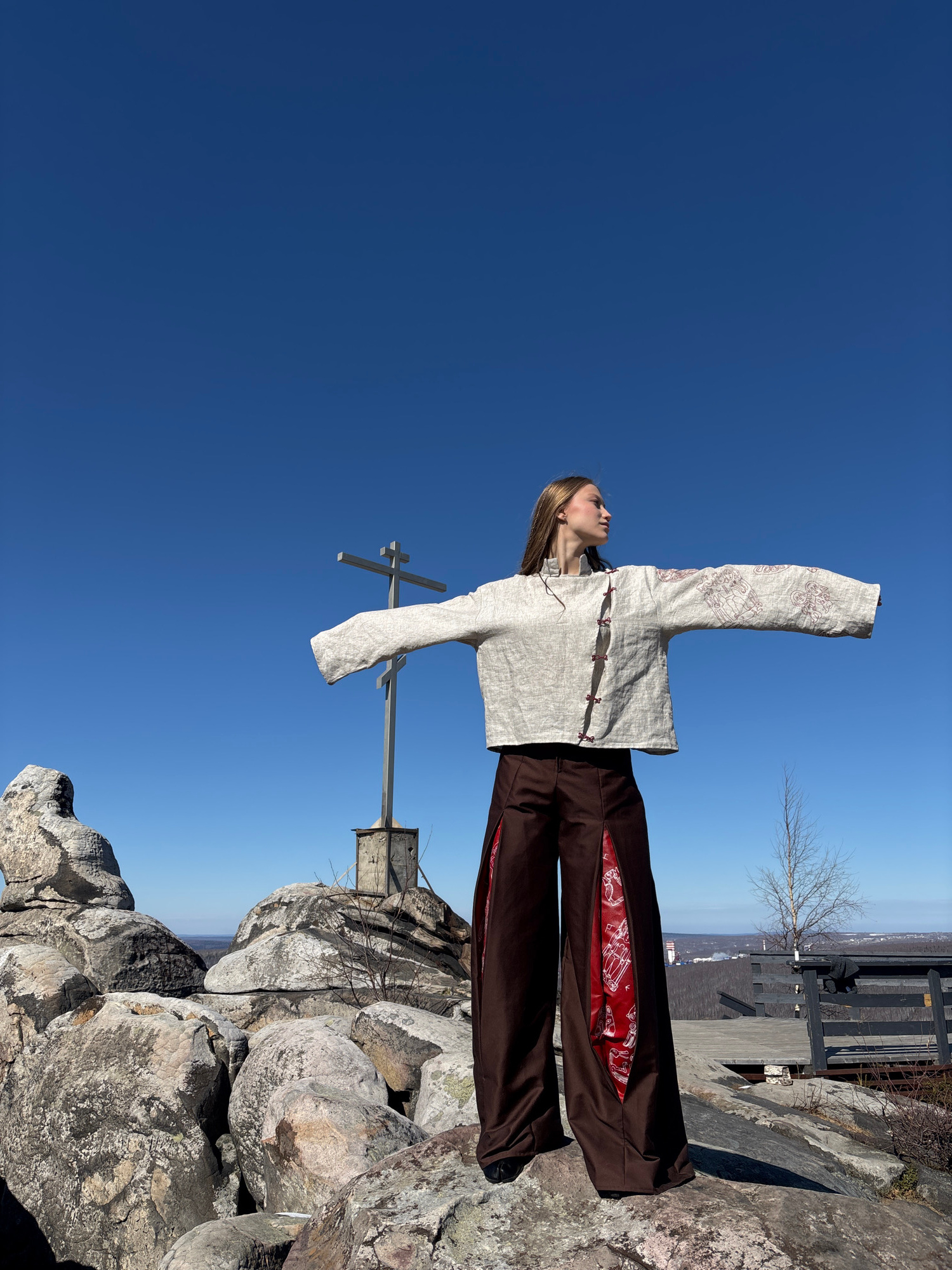 A young woman stands on a rocky summit in Gubakha, Russia, facing the sky with arms outstretched in a cruciform posture. A metal cross is visible nearby. She is wearing brown trousers with red pattern…read more