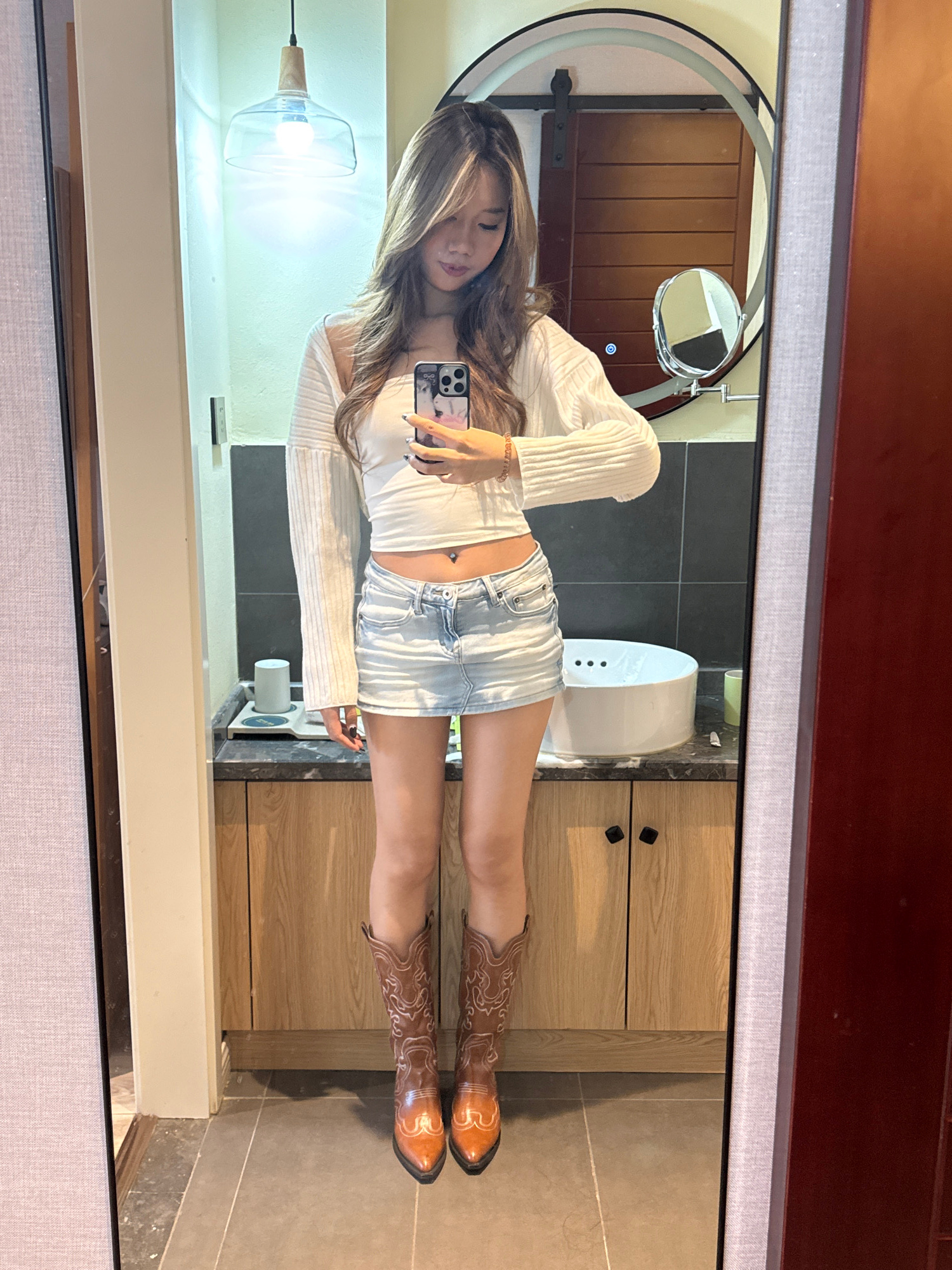 A young woman is captured taking a mirror selfie in what appears to be a modern bathroom or dressing area. She stands facing the mirror, holding a smartphone with a decorative case in her right hand.…read more