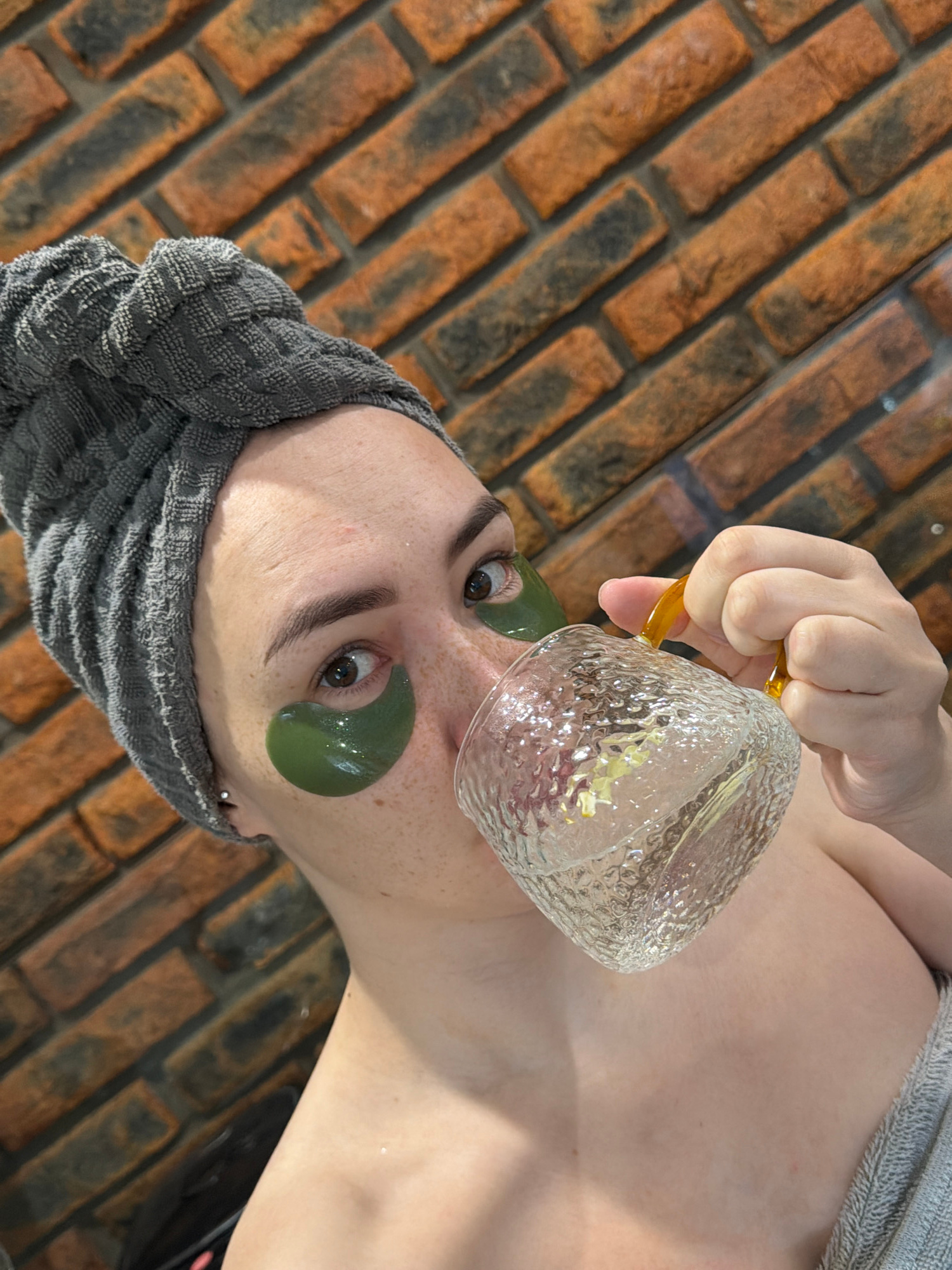 A woman lies on a brick surface, wearing a gray towel wrapped around her head and green eye patches. She is holding a clear glass cup with a yellow handle near her face. The location is potentially inβ¦read more