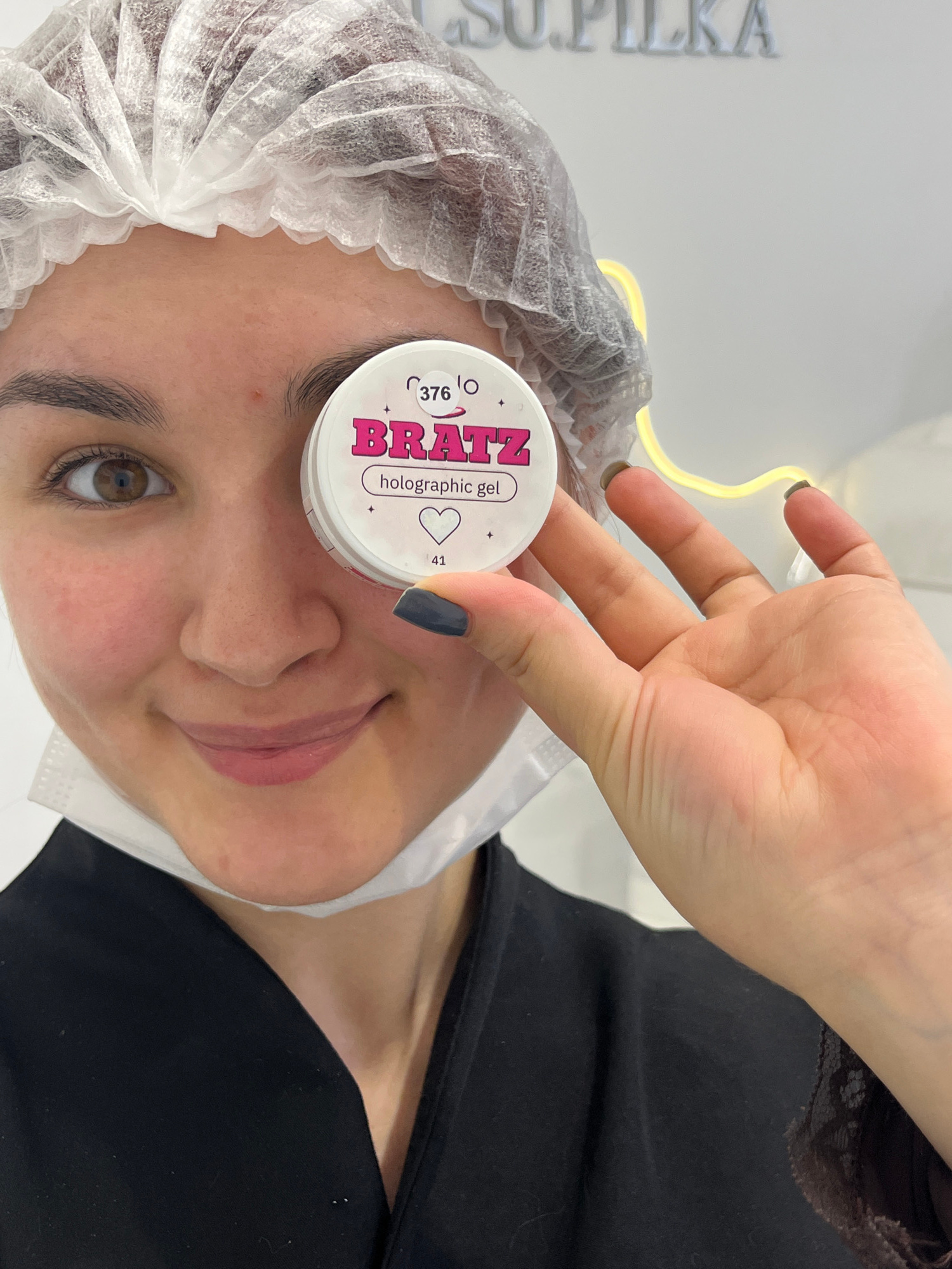 A young adult female is depicted in a close-up, upper-body shot, smiling slightly and facing the camera. She wears a white disposable hairnet and a white disposable face mask positioned below her chin…read more