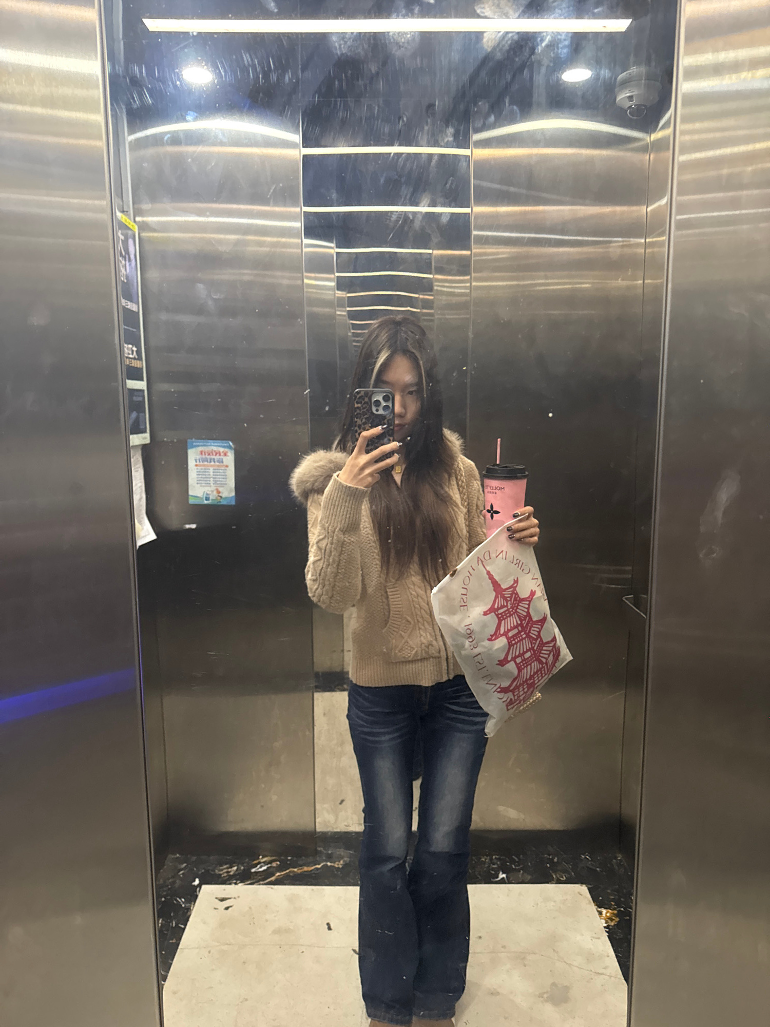 A young woman with long brown hair and wearing a tan sweater and blue jeans is taking a selfie in an elevator. She is holding a pink cup with a straw in one hand and a white shopping bag with a red de…read more