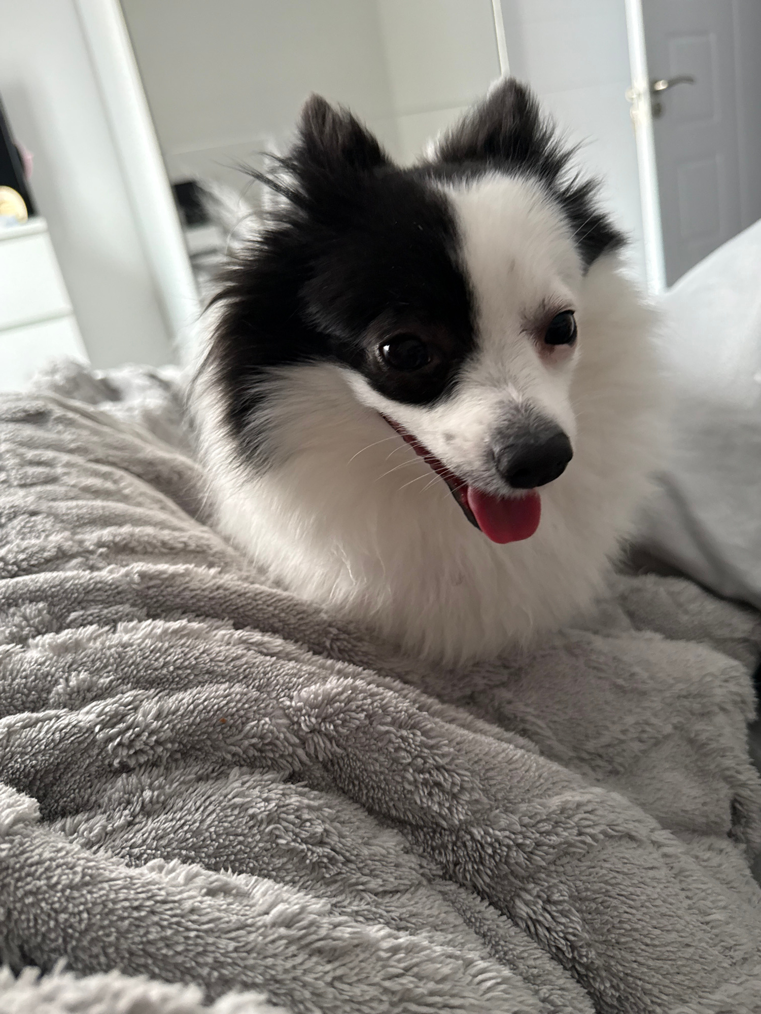A black and white dog lies on a gray, plush blanket. The dog is panting with its tongue visible. In the background, a portion of a white wall and a silver faucet are visible. The location of the image…read more