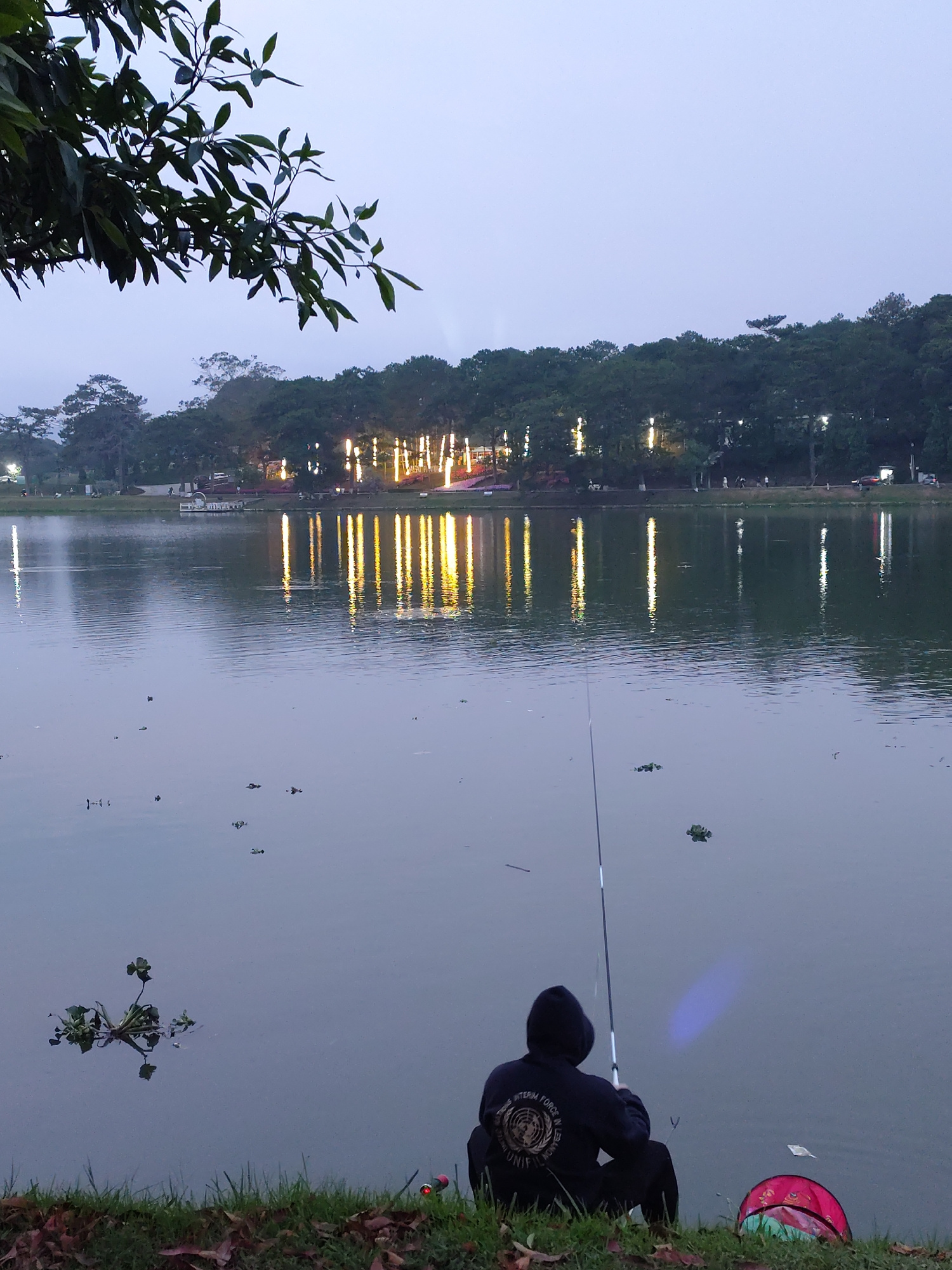 An individual is fishing at Xuan Huong Lake in Da Lat, Vietnam. The person, wearing a dark hooded sweatshirt and dark pants, is seated on the grassy bank of the lake, holding a fishing rod. A tackle b…read more
