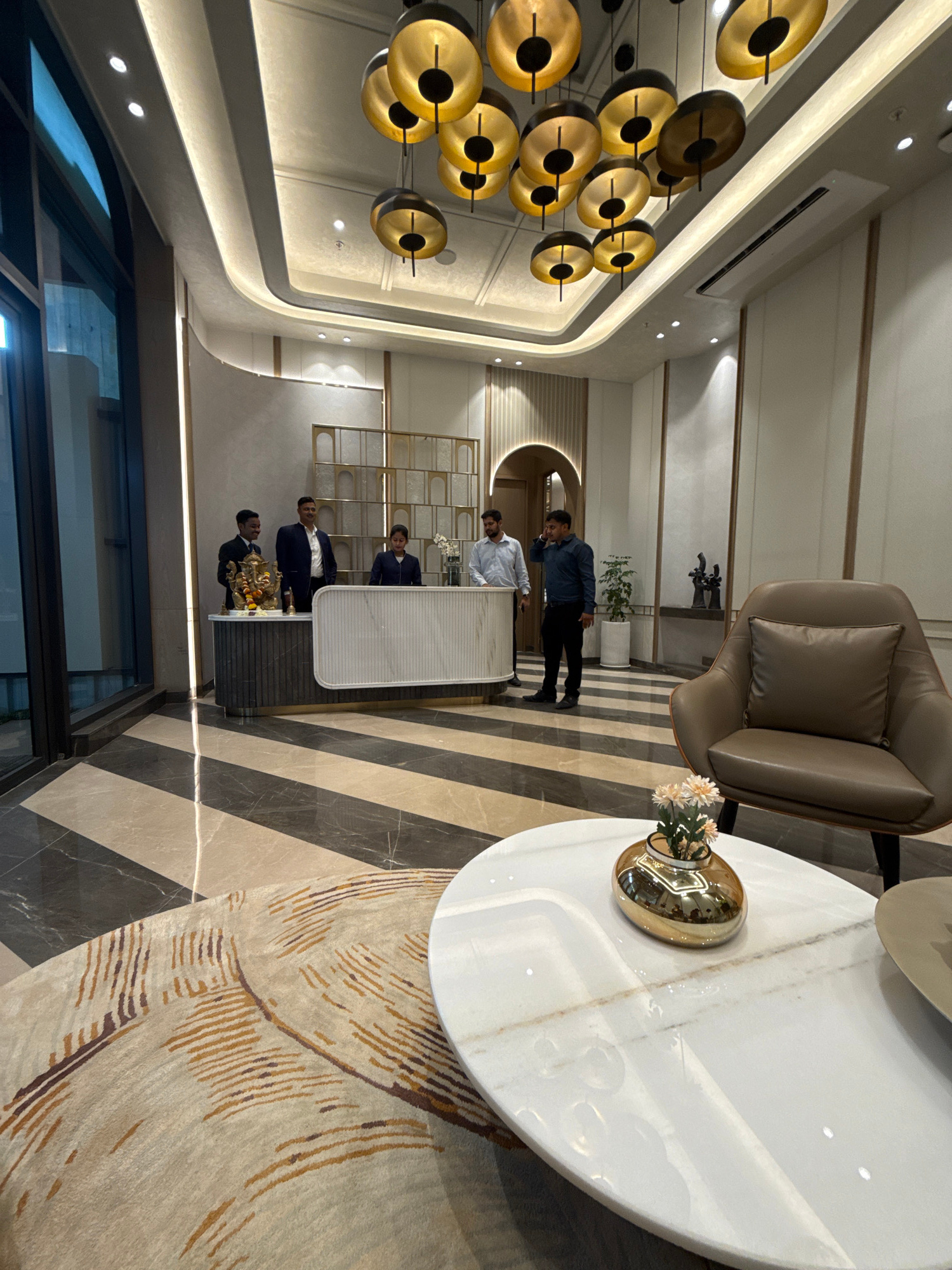 Here is a detailed description of the image: **Scene:** The interior of a modern, upscale commercial space, likely a hotel lobby or reception area, located in Pimpri-Chinchwad, India. **Environment:…read more