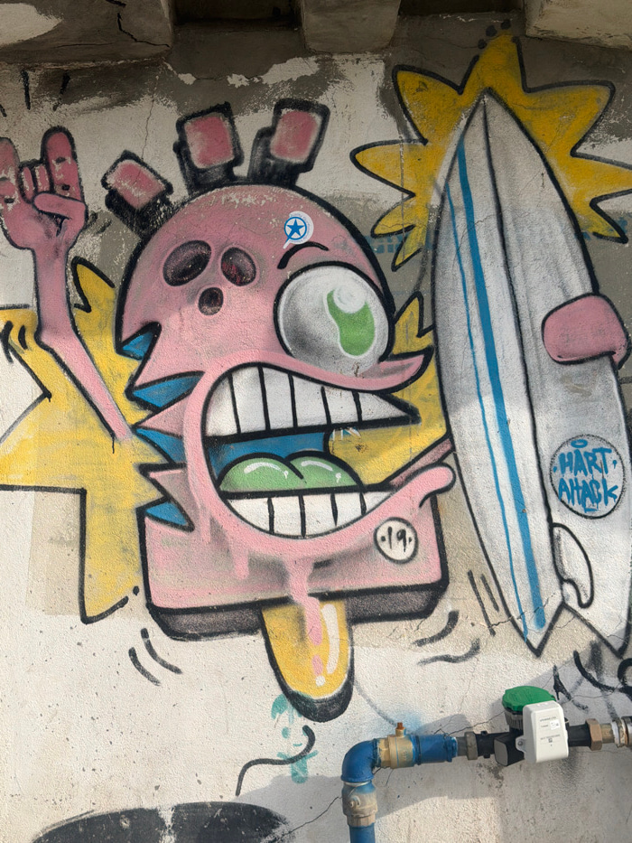 The image displays colorful graffiti on a textured, light-colored concrete or stucco wall in Tel-Aviv, Israel. The precise location within the city cannot be determined from the visual evidence. The…read more