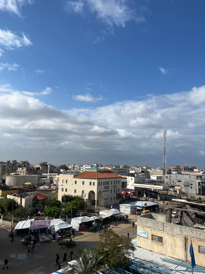 An elevated view captures an active urban scene in Khan Yunis, Palestinian Territory, under a partly cloudy sky with patches of blue. The central focus is a prominent light-colored, multi-story buildi…read more