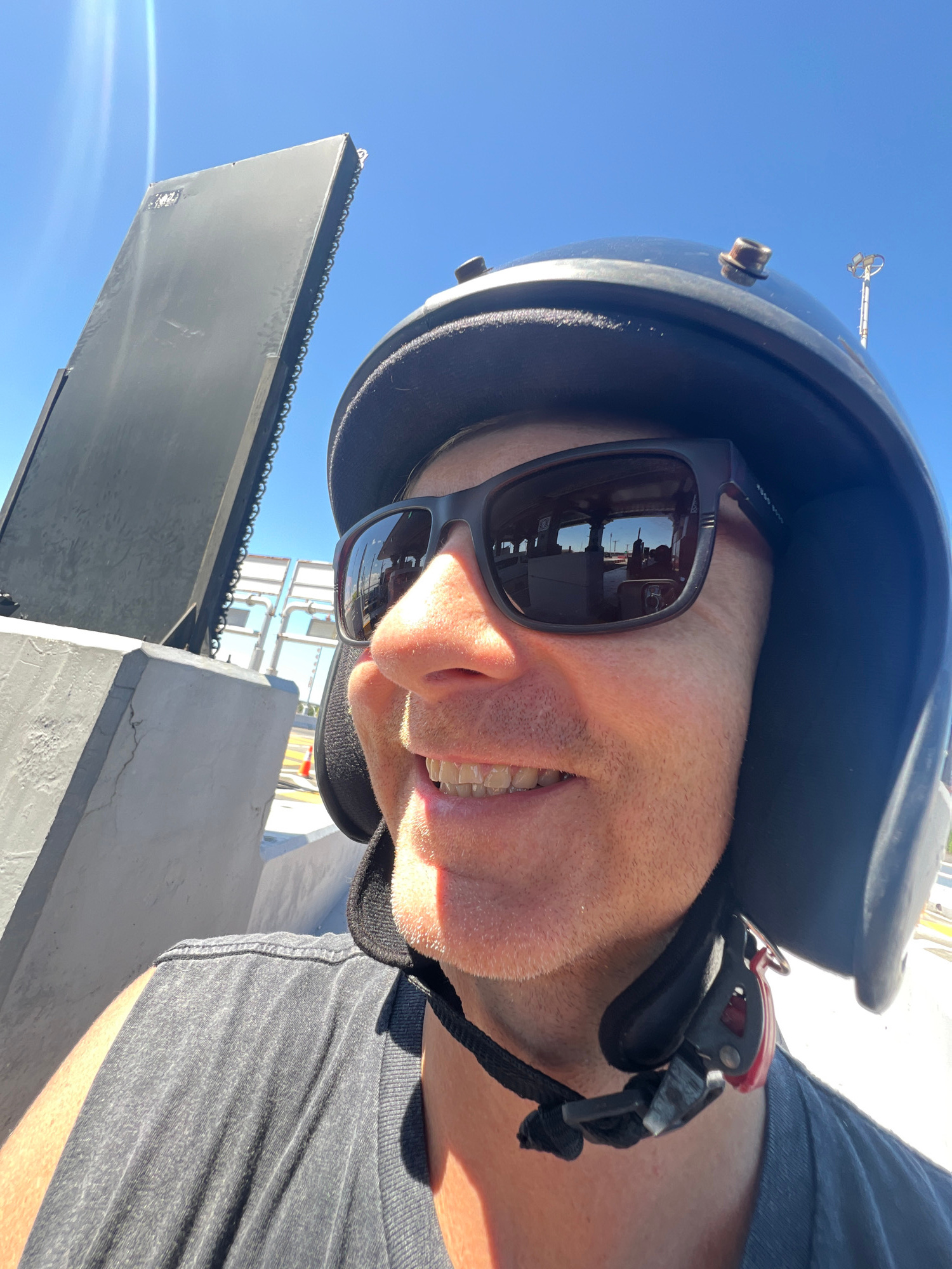 A man is wearing a helmet and sunglasses and smiling. The location is Denpasar, Indonesia. In the background, there are buildings and a clear blue sky. The sunglasses reflect what appears to be buildi…read more