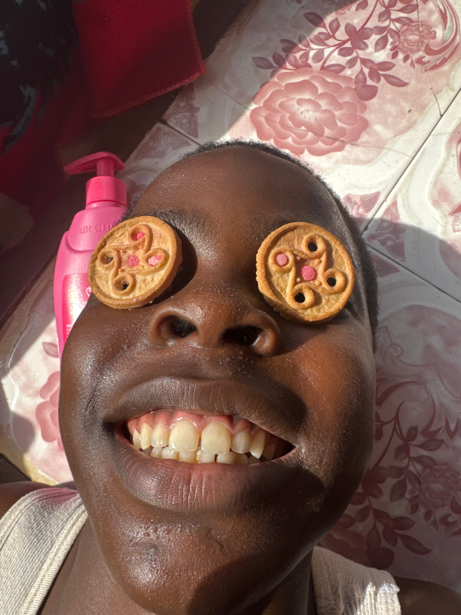 A medium shot shows a person, likely in Onitsha, Nigeria, lying on a surface covered with rose patterned floor tiles. A pink bottle of hair product is positioned near the person's left ear. Two roundβ¦read more