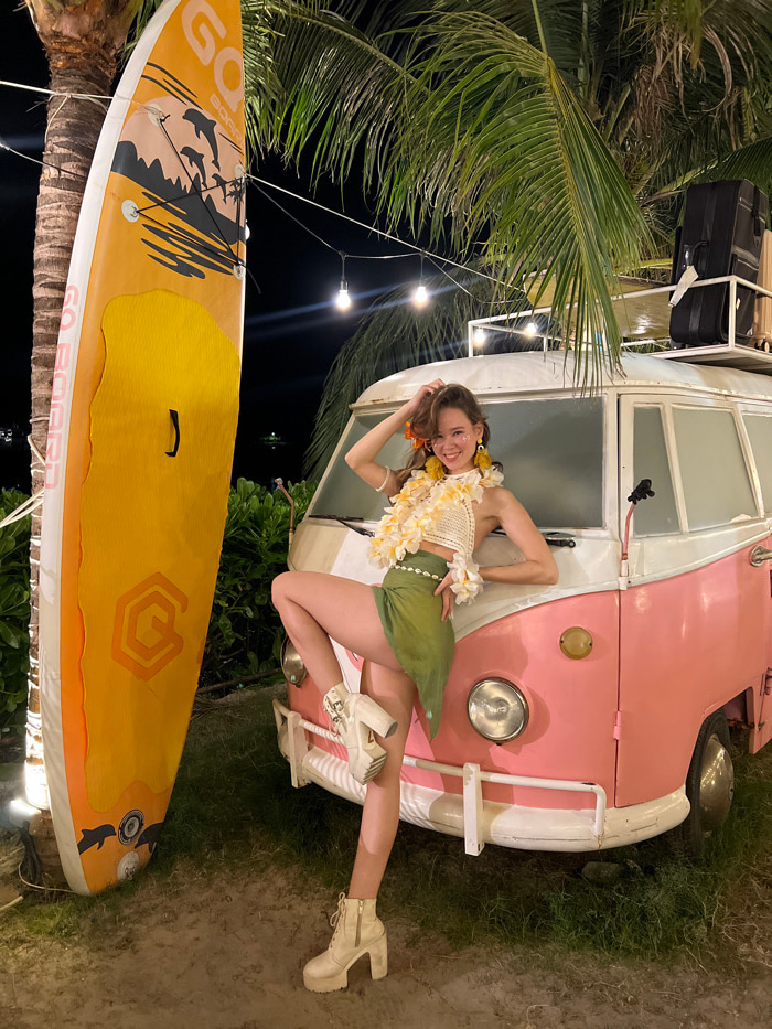 The scene depicts a young adult female posing at night in a tropical-themed outdoor setting in Nha Trang, Vietnam. She stands in front of a stationary, two-tone pink and white Volkswagen Type 2 van, l…read more