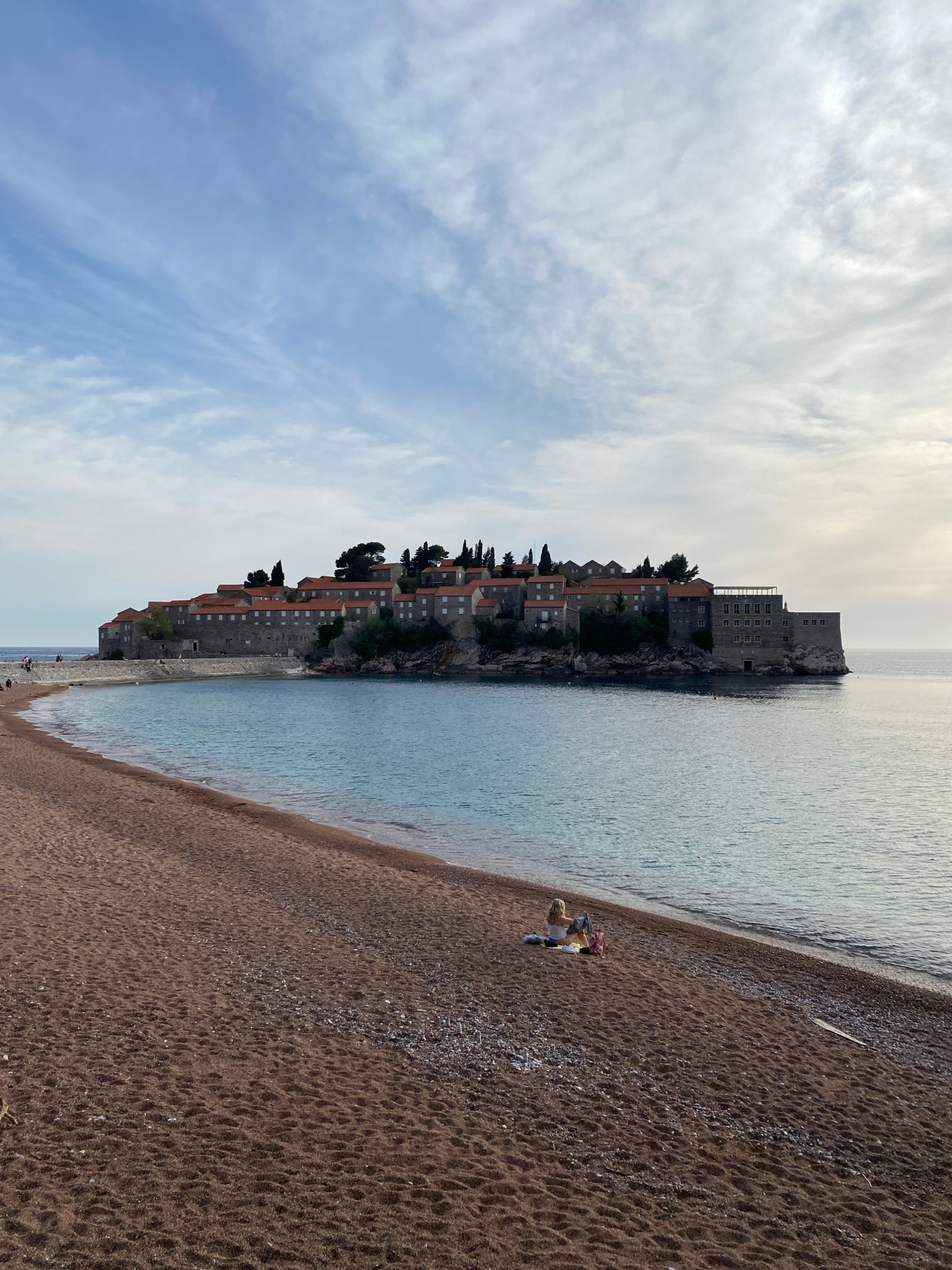 The image shows the island of Sveti Stefan in Montenegro, as viewed from a beach. The island, which is now a resort, is characterized by buildings with red tile roofs clustered together on the rocky l…read more