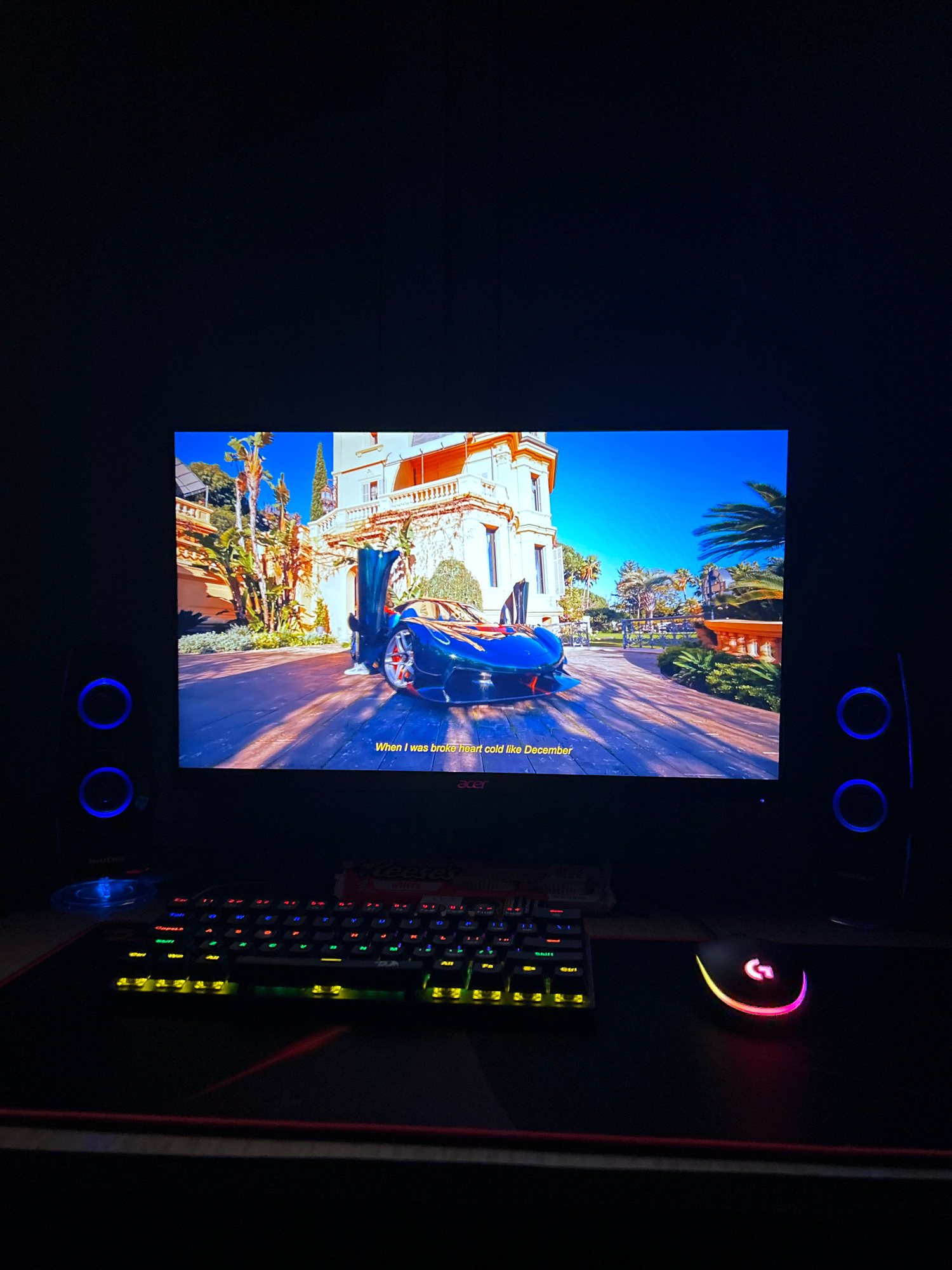 The image shows a computer setup in a dark room. On the desk is a monitor displaying a scene of a blue car parked in front of a white building with palm trees, under a clear blue sky. Text is visible…read more