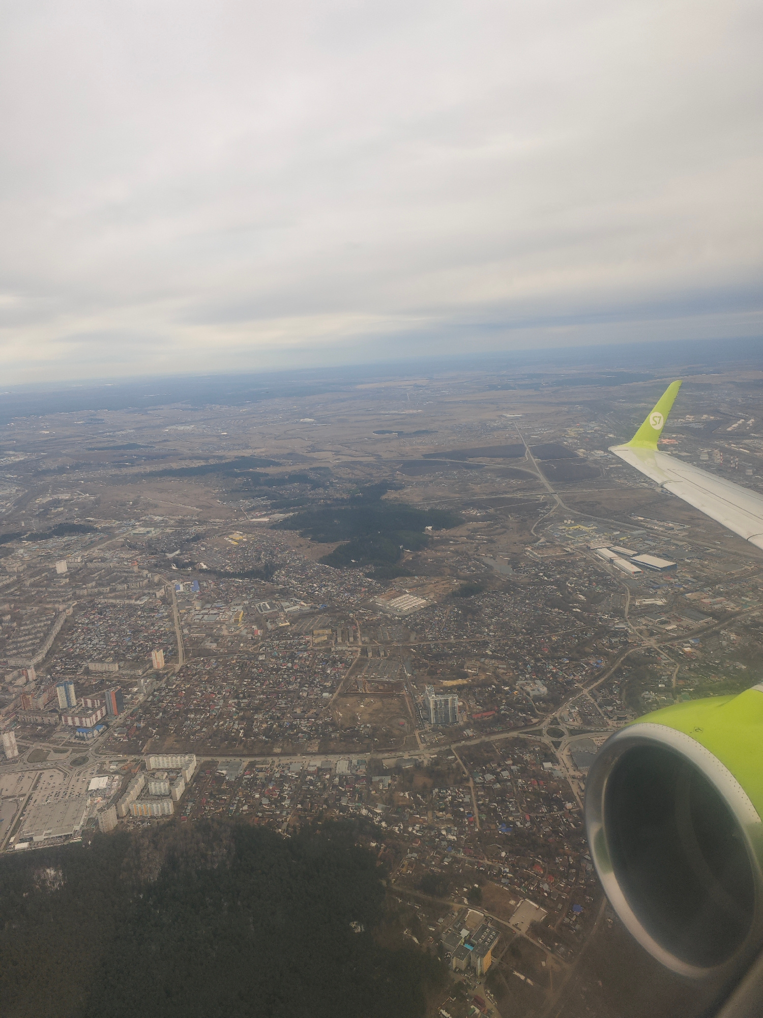 The image shows an aerial view from a plane, presumably during descent or ascent, over the city of Novosibirsk, Russia. An aircraft wing and engine are visible in the foreground, with the "S7" logo on…read more