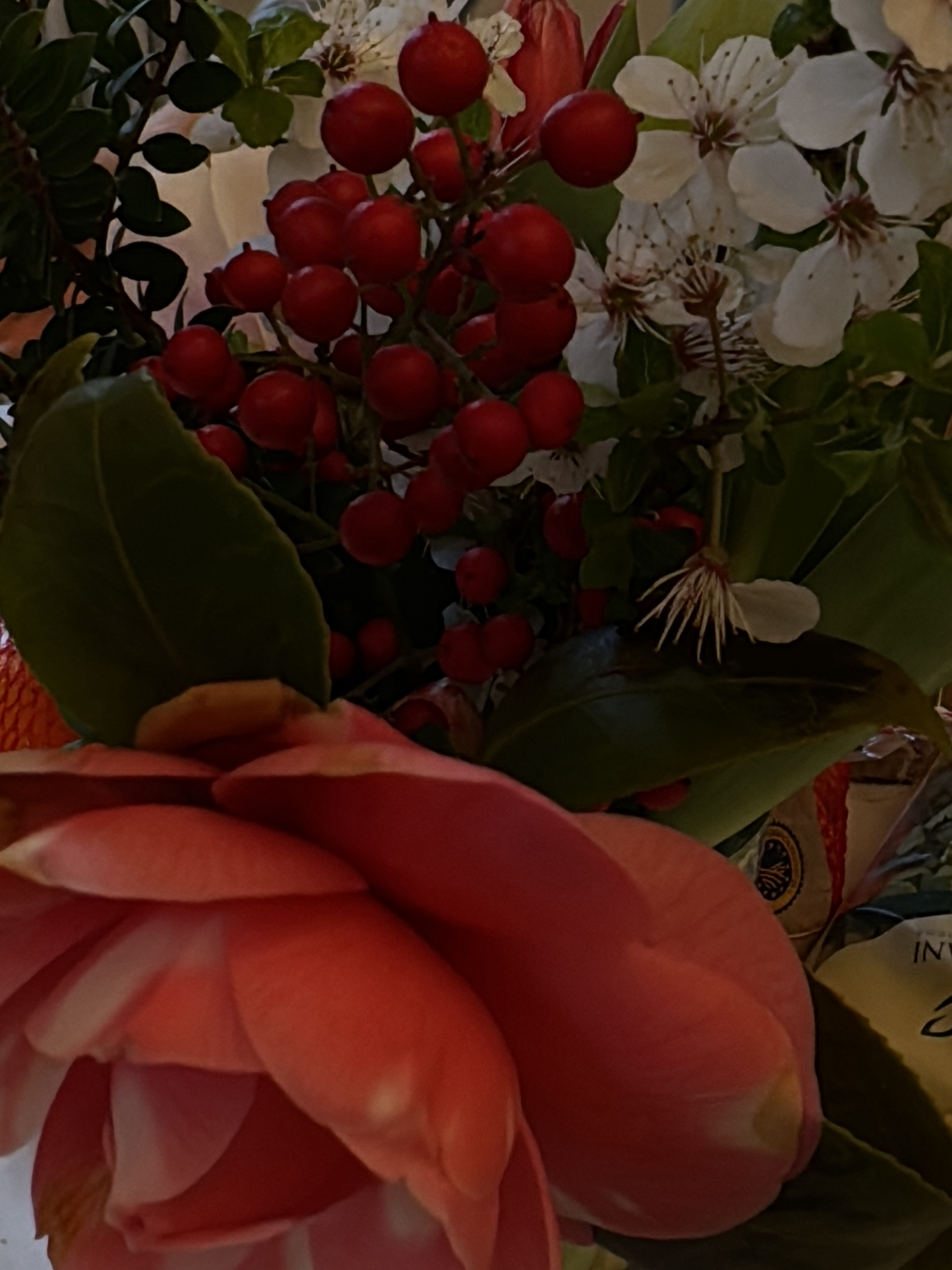 The image displays a close-up of a floral arrangement. A large, multi-petaled flower, primarily pink and deep rose, occupies the lower left foreground, exhibiting layered petals with lighter pink and…read more