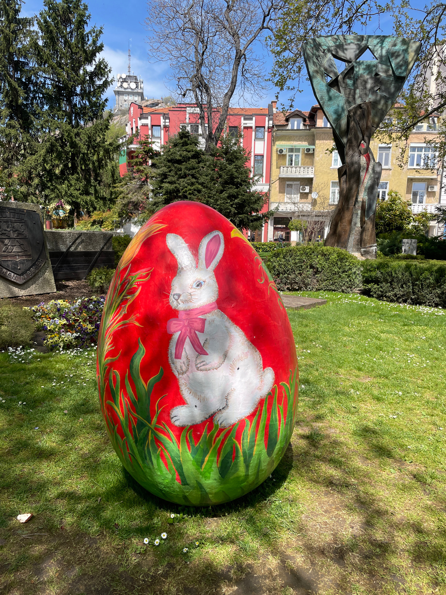 A vibrant, large, artificially-colored Easter egg is prominently displayed in a park setting, lying on its side on a patch of green grass. The egg is painted with a bright red background, featuring a…read more
