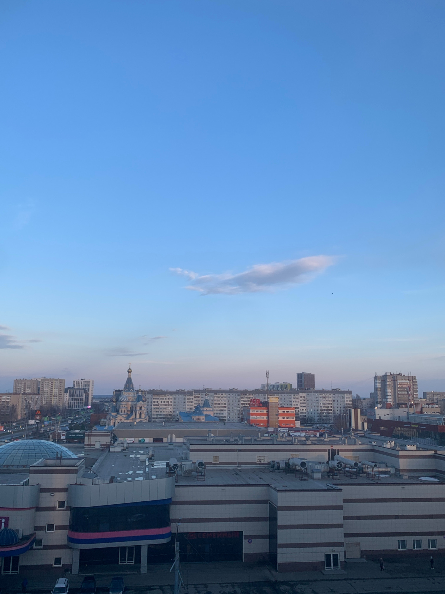 The image shows a cityscape in Izhevsk, Russia, under a blue sky with scattered clouds. Buildings of varying heights and architectural styles are visible, including residential blocks and a large shop…read more