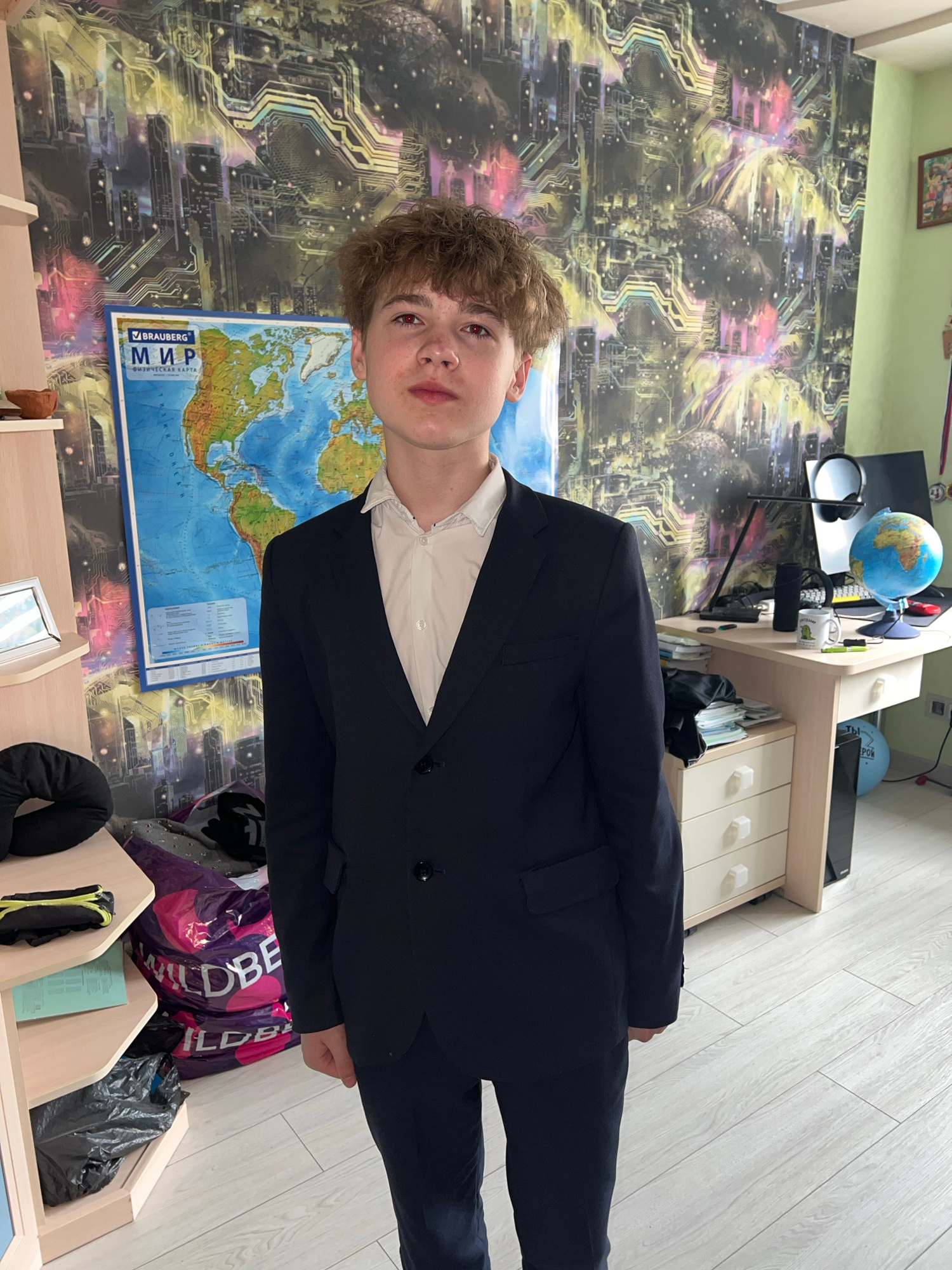 A fair-skinned young man with curly, light brown hair is standing indoors, wearing a dark blue suit jacket over a white button-down shirt. The background consists of a wallpaper with a futuristic circ…read more
