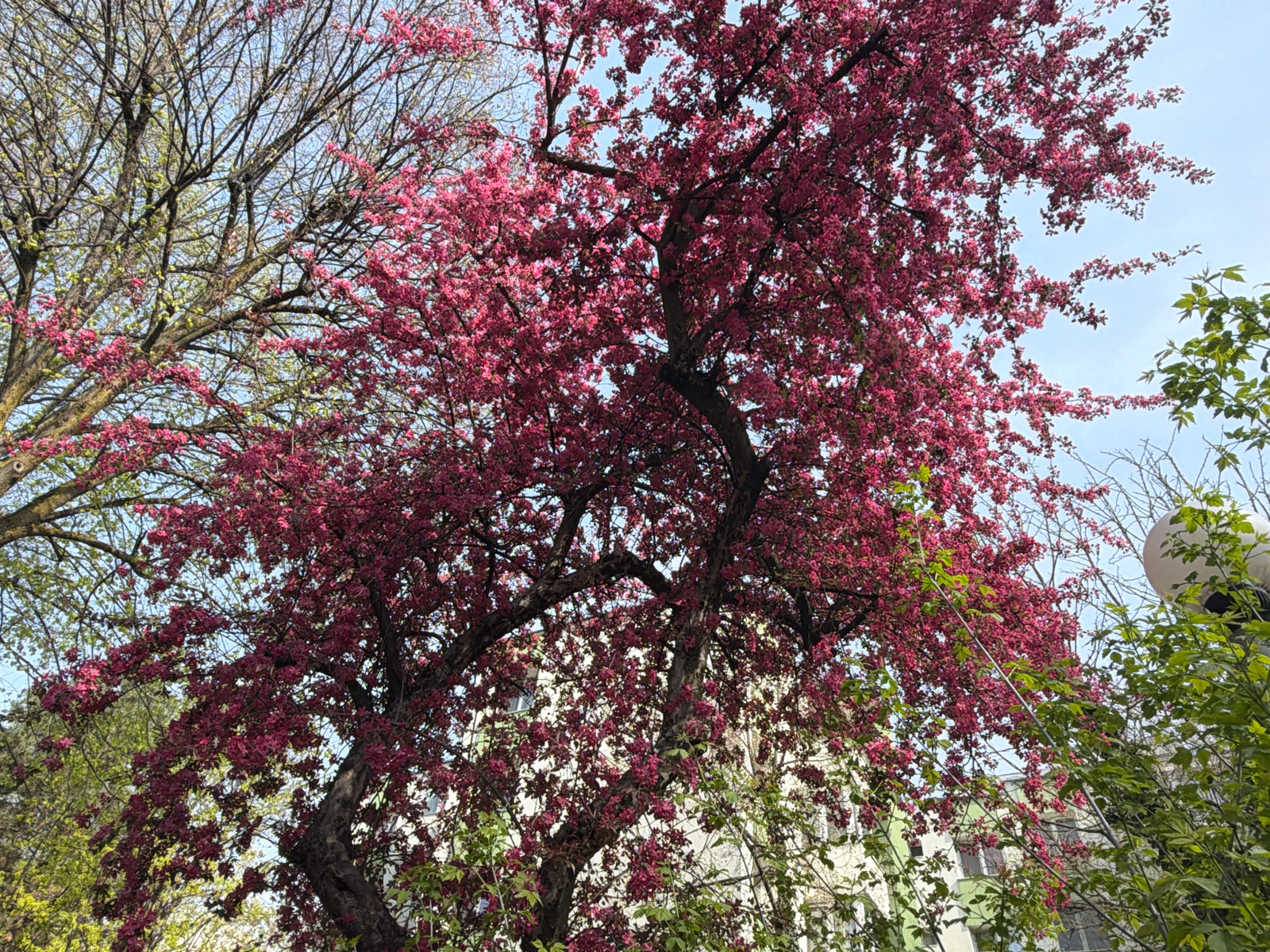 The image presents a view of trees in full bloom, with a mix of pink and green foliage, set against a partially visible building. The trees' canopy fills much of the frame, with some bare branches vis…read more