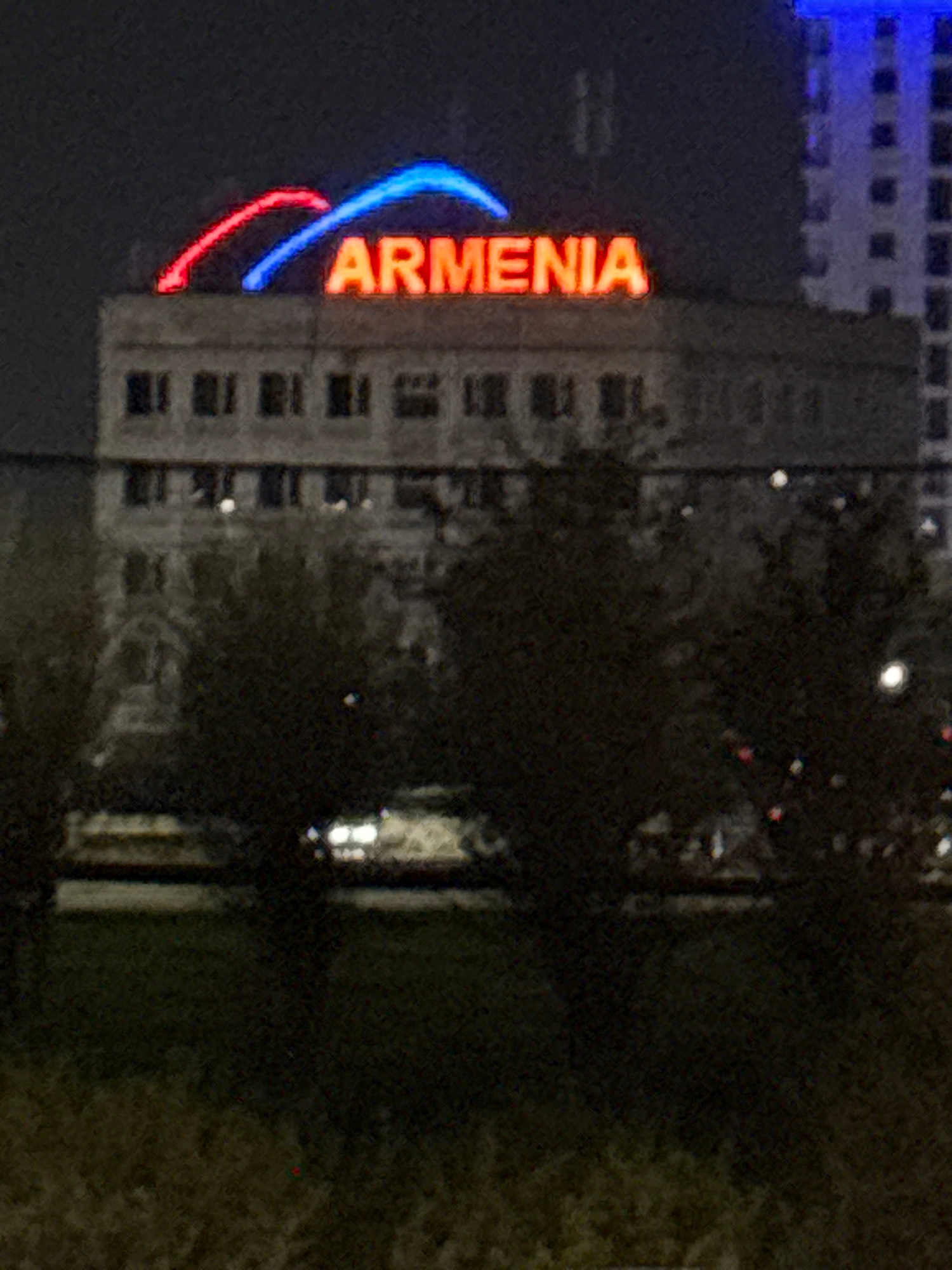 The image shows a nighttime view of a building in Yerevan, Armenia. The building has a sign on the top that says "ARMENIA" in orange neon letters, with blue and red neon arcs wrapping around the name.…read more