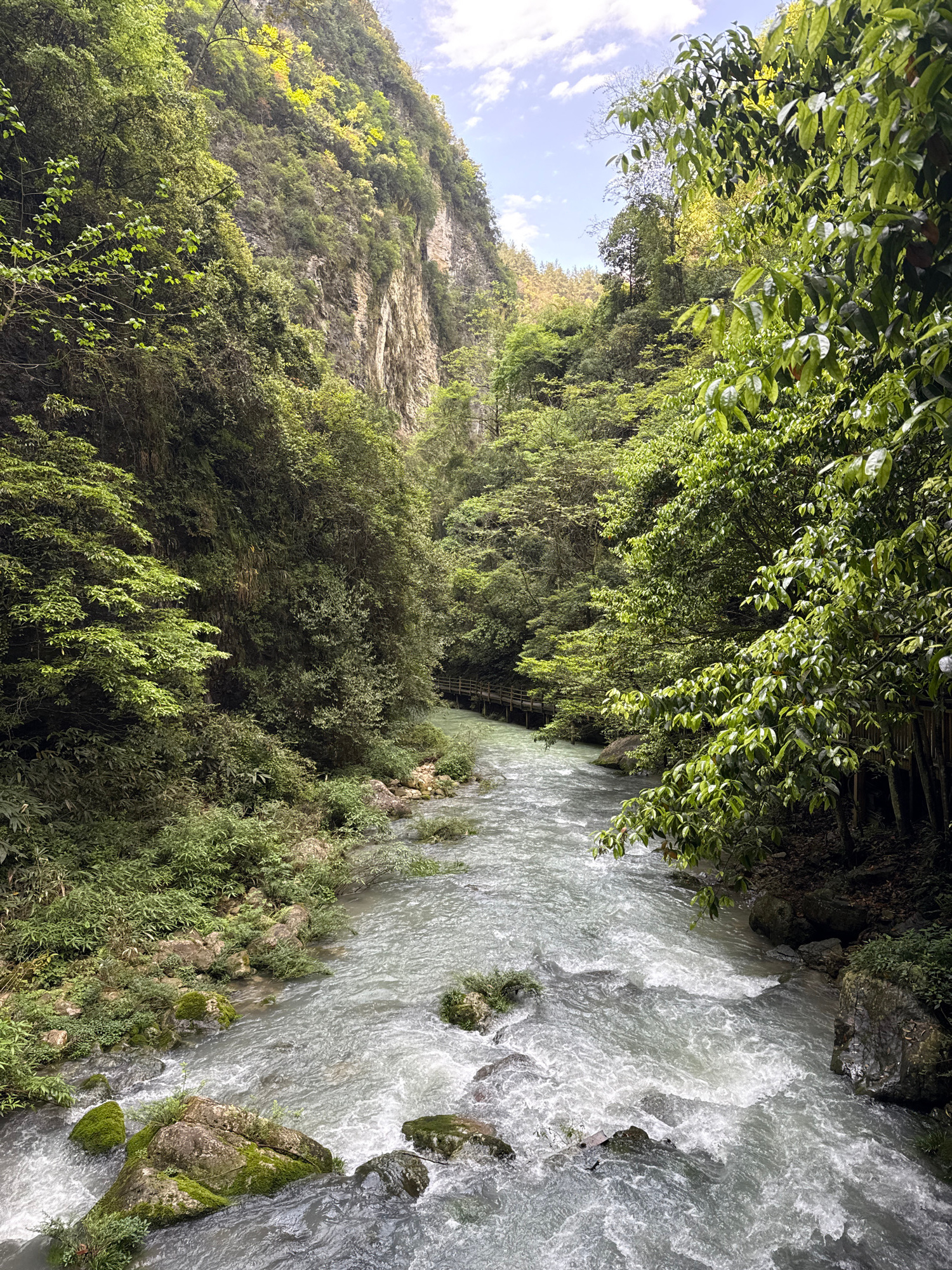 A rushing river cuts through a lush, forested canyon. The water is turbulent and white-grey, suggesting a strong current. Dense vegetation lines the riverbanks and covers the canyon walls. The scene e…read more