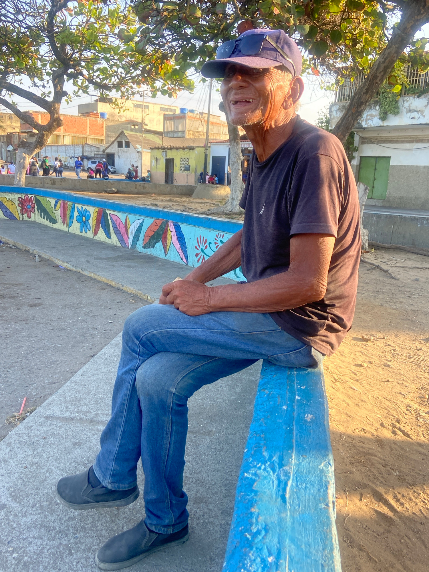An elderly man wearing a dark blue t-shirt, blue jeans, and a blue baseball cap is sitting on a painted blue concrete structure. He is smiling. The structure is decorated with painted flowers and leav…read more