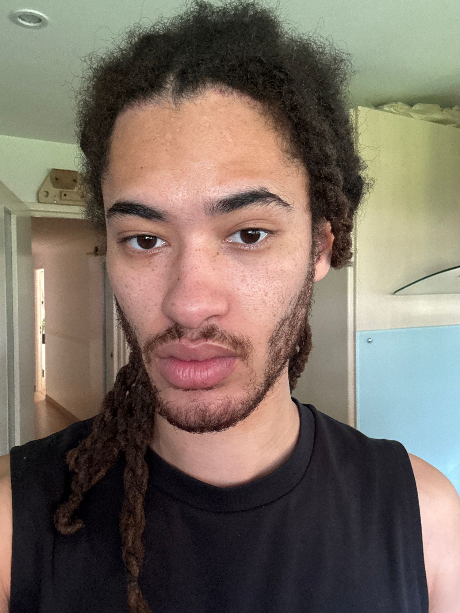 The original image, presented rotated 90 degrees counter-clockwise, is a close-up, eye-level portrait of a young man, likely in his late teens or early twenties, taken indoors in Les Ulis, France. He…read more