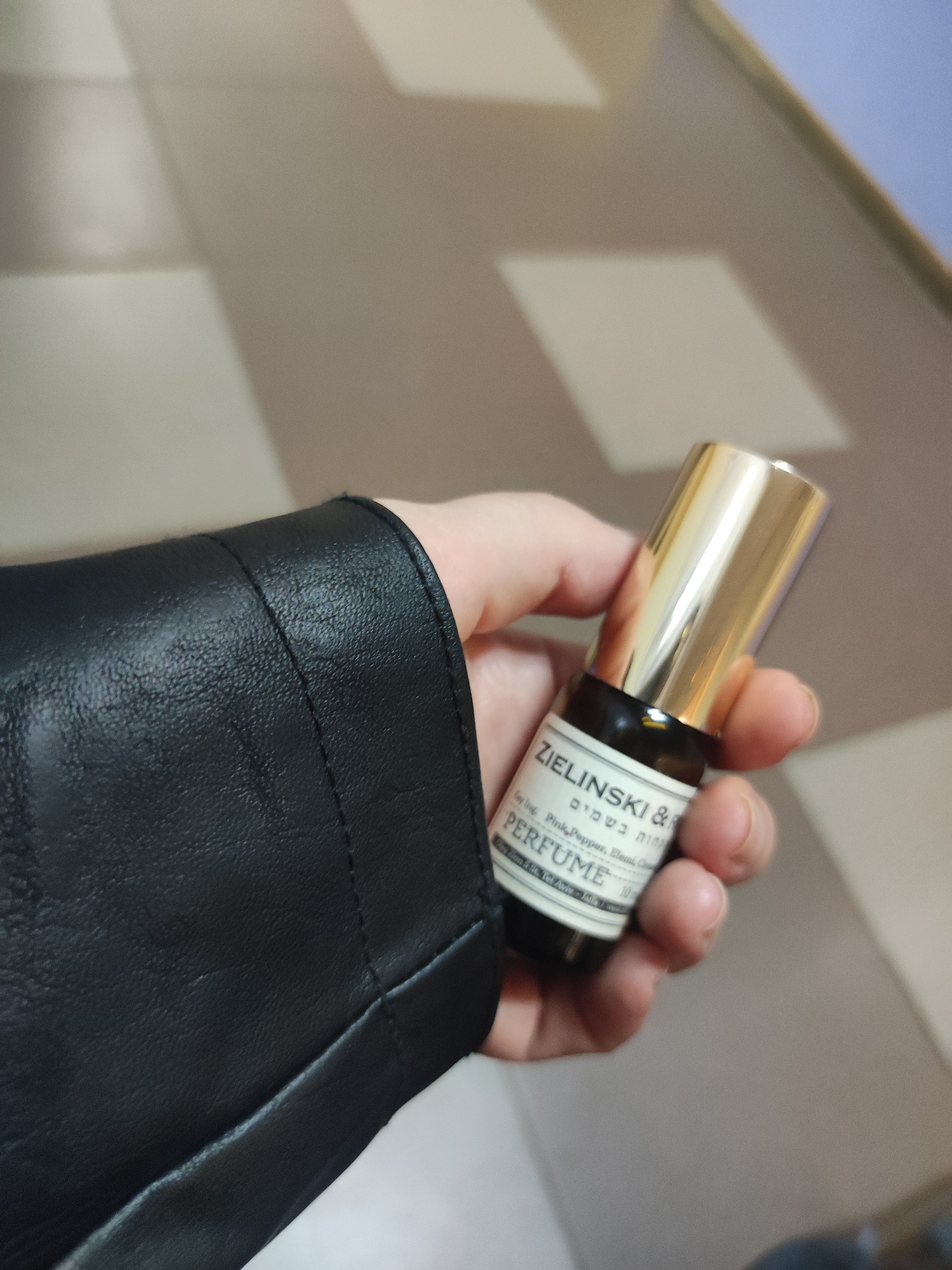 A hand clad in a black leather jacket holds a small bottle of Zielinski & Rozen perfume with a gold cap. The label on the bottle lists ingredients as "Pink Pepper, Elemi, Cloves" and states "Made and…read more
