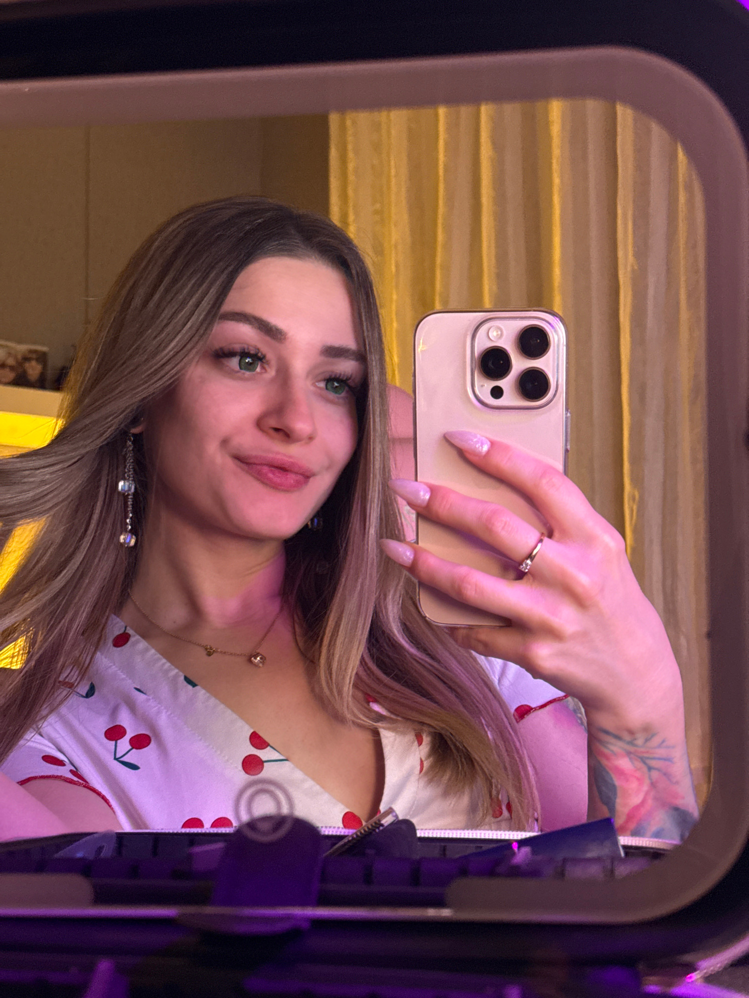 A young woman is taking a selfie using a smartphone, likely an iPhone, held in her right hand. Her arm with a floral tattoo is visible. She has green eyes, fair skin, and shoulder-length brown hair. T…read more