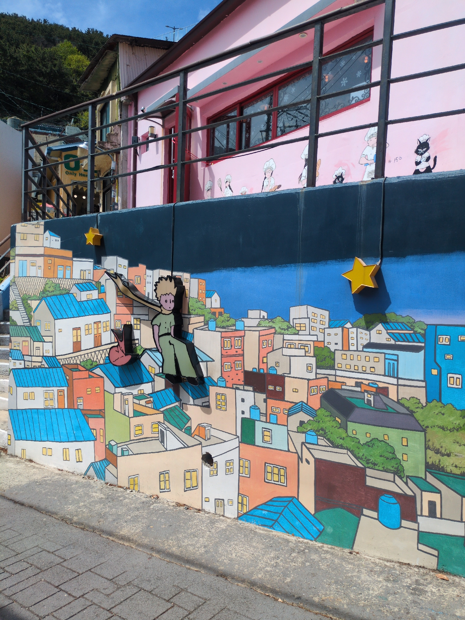 The image depicts a colorful mural featuring The Little Prince on a wall in Busan, South Korea. The mural shows the prince soaring over buildings, with painted and attached 3D yellow stars. The pink b…read more