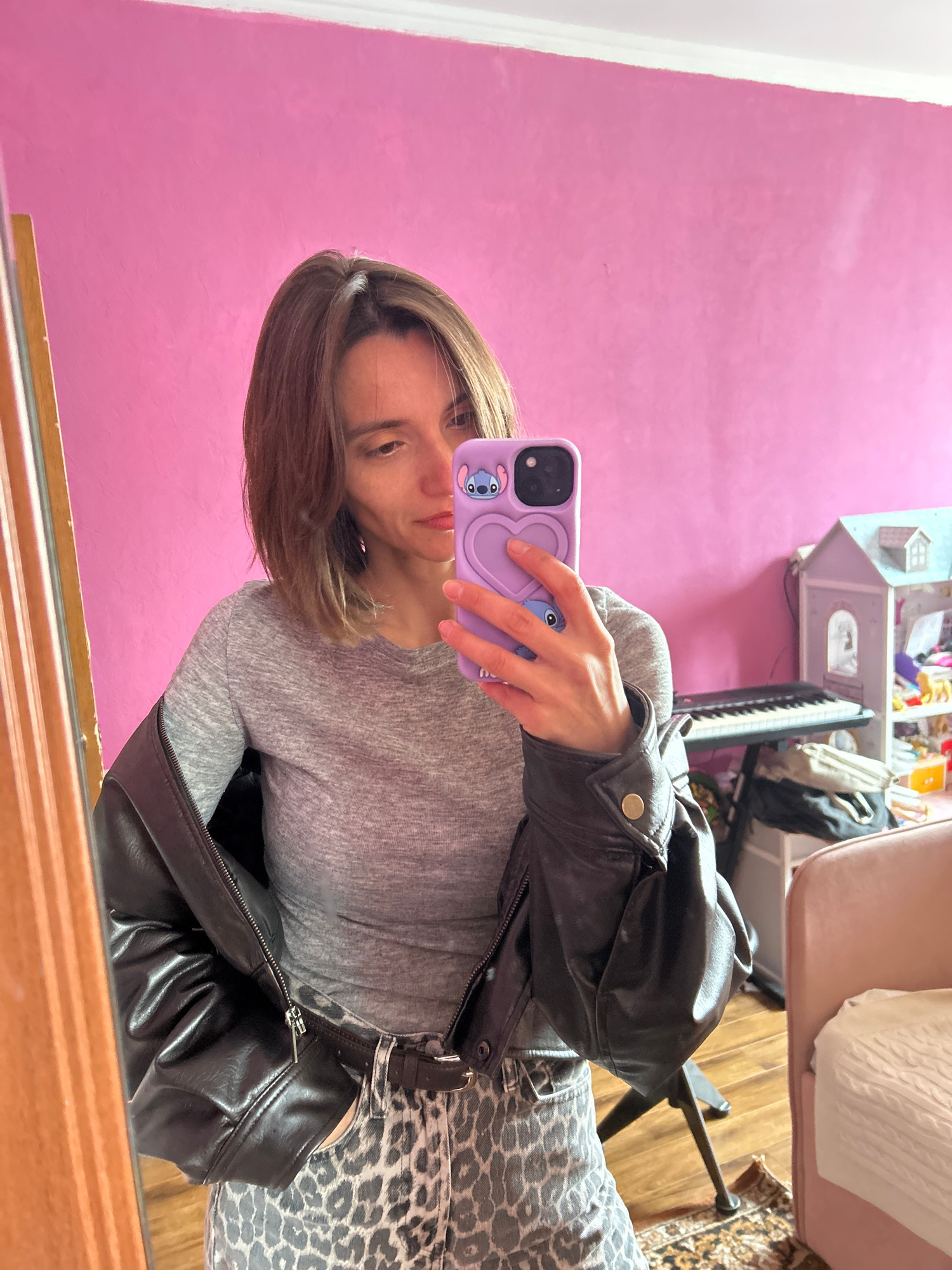 A young woman is taking a selfie in front of a mirror. She is wearing a gray long-sleeved shirt and a black leather jacket. The case of her phone is purple and has a cartoon character on it. The backg…read more