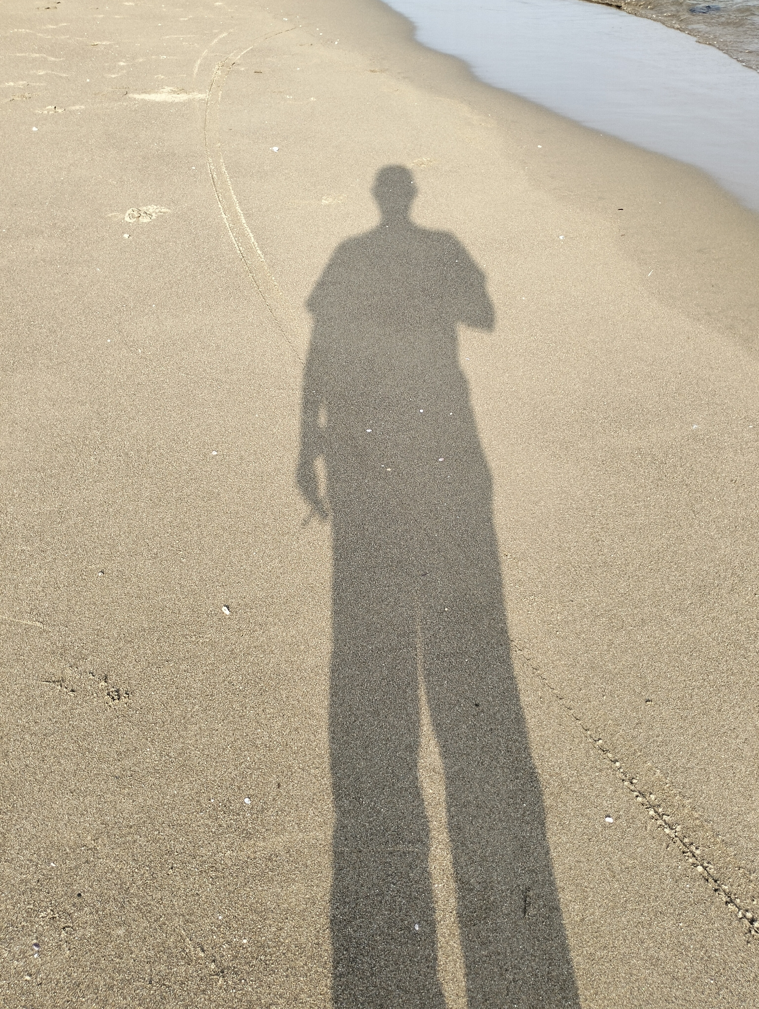 A shadow of a person is cast upon a sandy beach in Curehtunong, Indonesia. The sand is predominantly tan, transitioning to a darker hue near the water's edge. The ocean is visible in the upper right o…read more