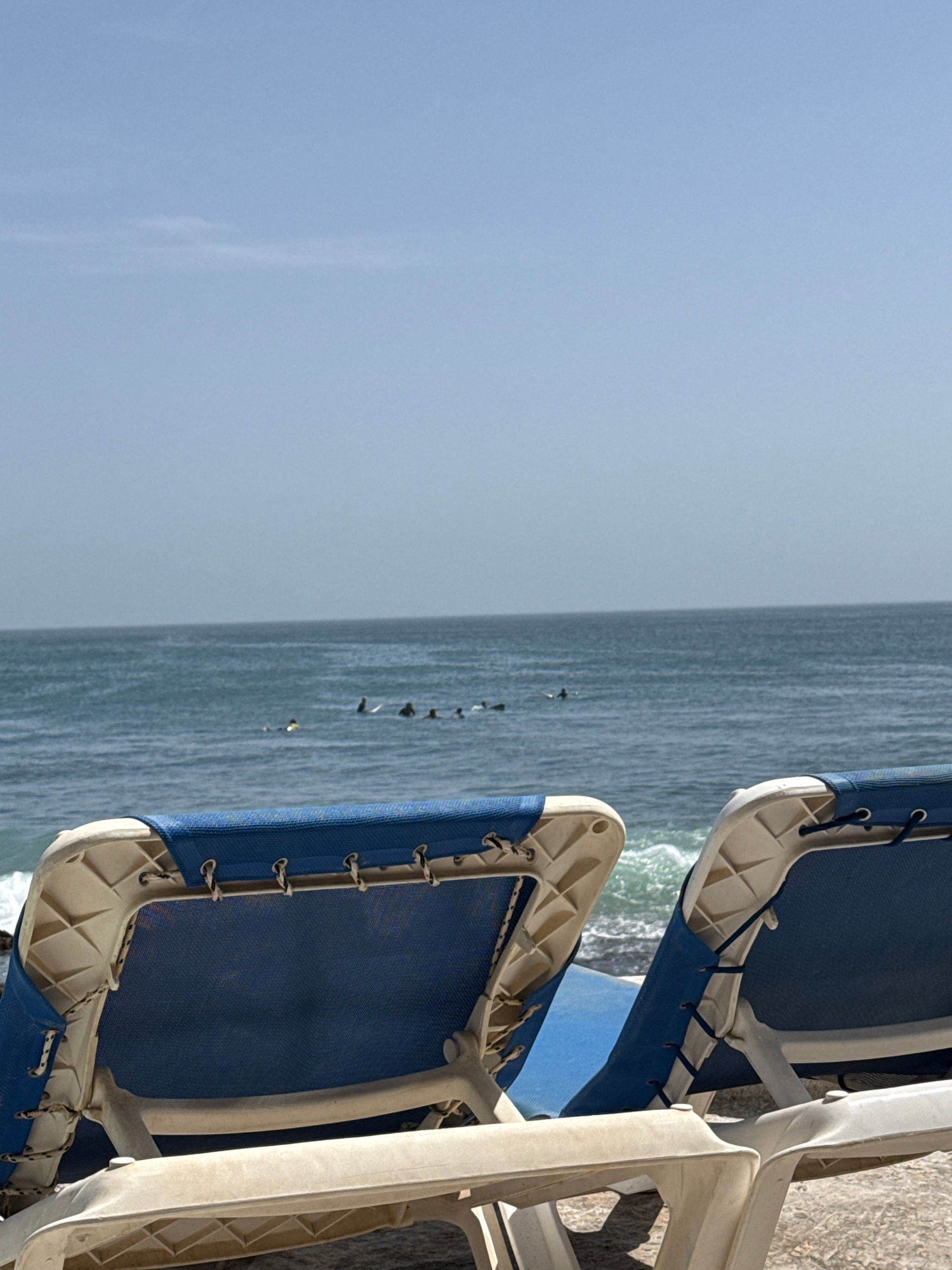 The image shows two empty blue and white beach chairs in the foreground, arranged vertically. Beyond the chairs, the sky and the ocean meet at the horizon. In the ocean, a group of dark objects, possi…read more