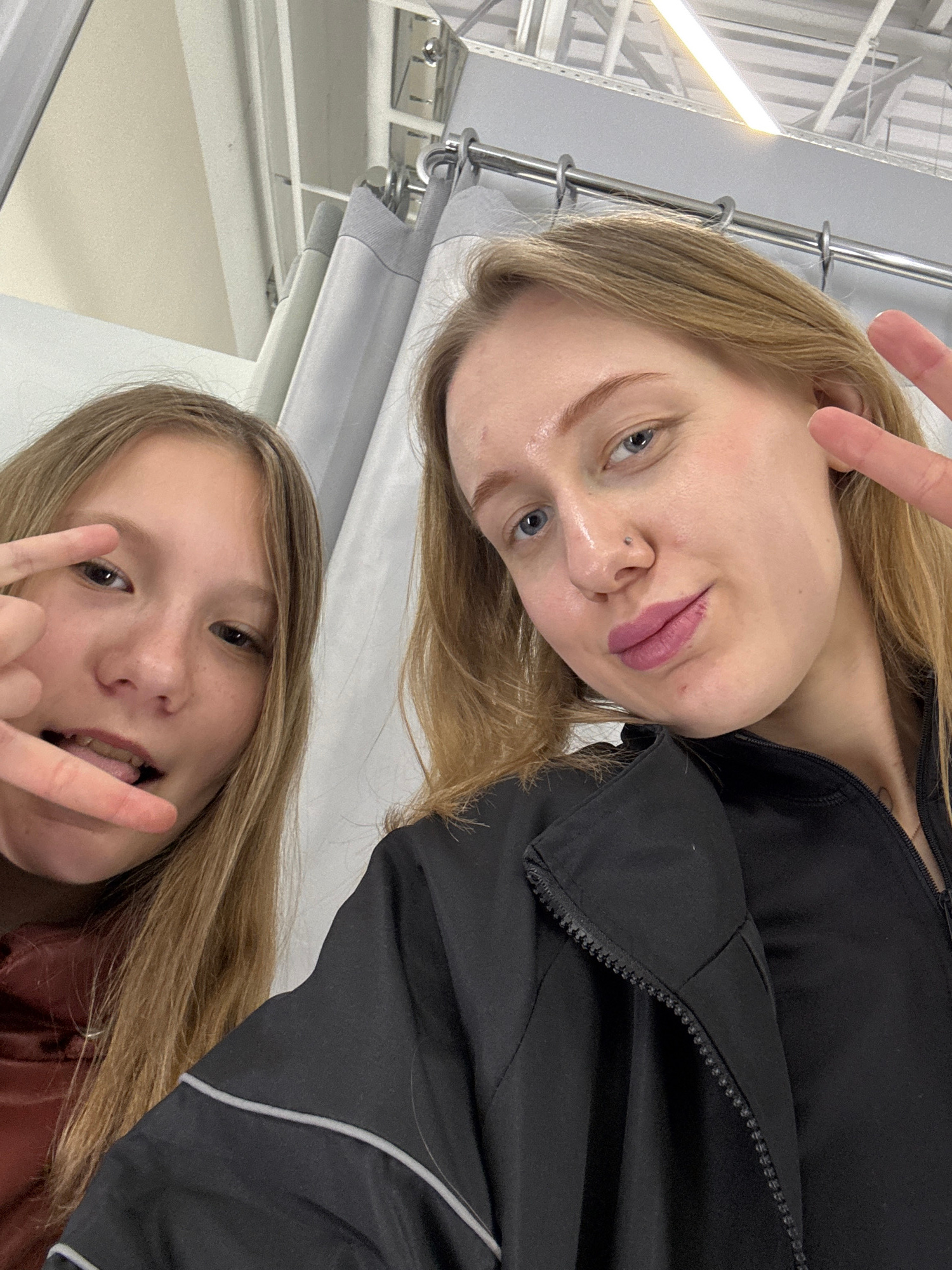 Two young women are posing for a selfie. The woman at the top of the frame has blonde hair and blue eyes. She is wearing a black jacket. The woman at the bottom of the frame has brown hair and brown e…read more