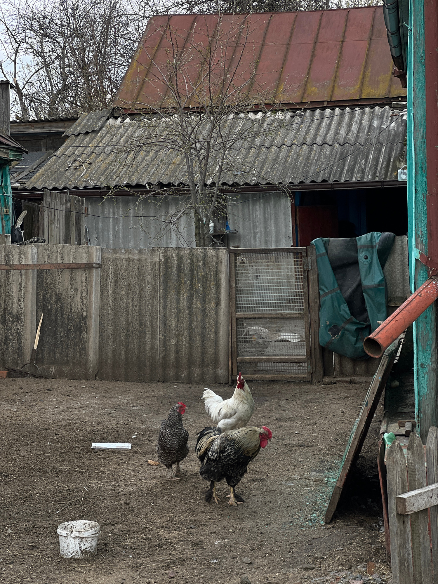 The scene depicts the exterior of a dilapidated structure in Semeno-Aleksandrovka, Russia. The building appears to be constructed of corrugated metal and wood, with sections of rusted roofing. A bare…read more