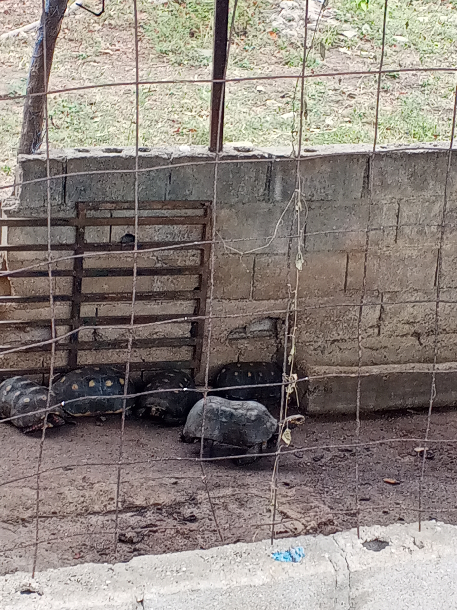 The image depicts a group of four turtles or tortoises confined behind a wire fence within an enclosure at an undisclosed location in the city of Tinaquillo, Venezuela. The enclosure has a concrete wa…read more