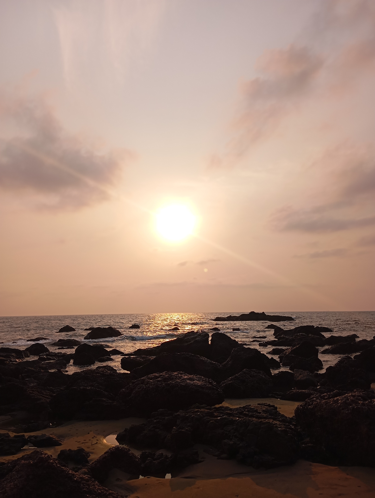 The image displays a serene sunset over a rocky beach in Querim, India. The sky, dominating the upper portion of the frame, is painted with soft, warm tones of orange, pink, and light purple, interspe…read more